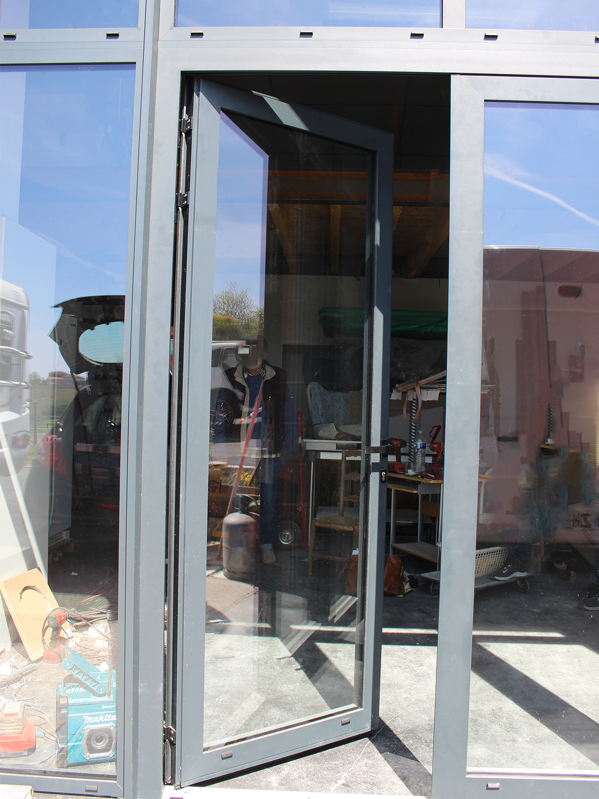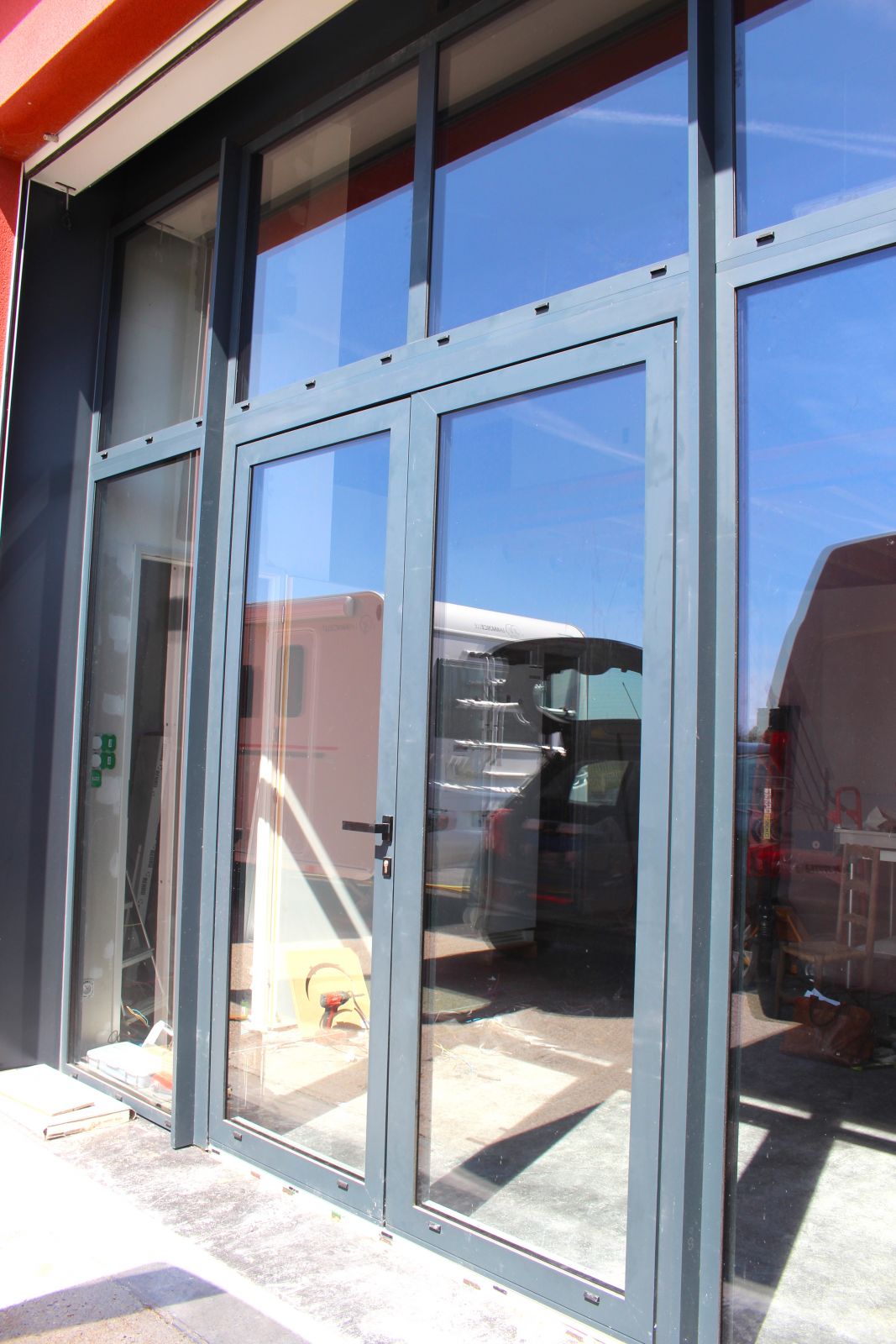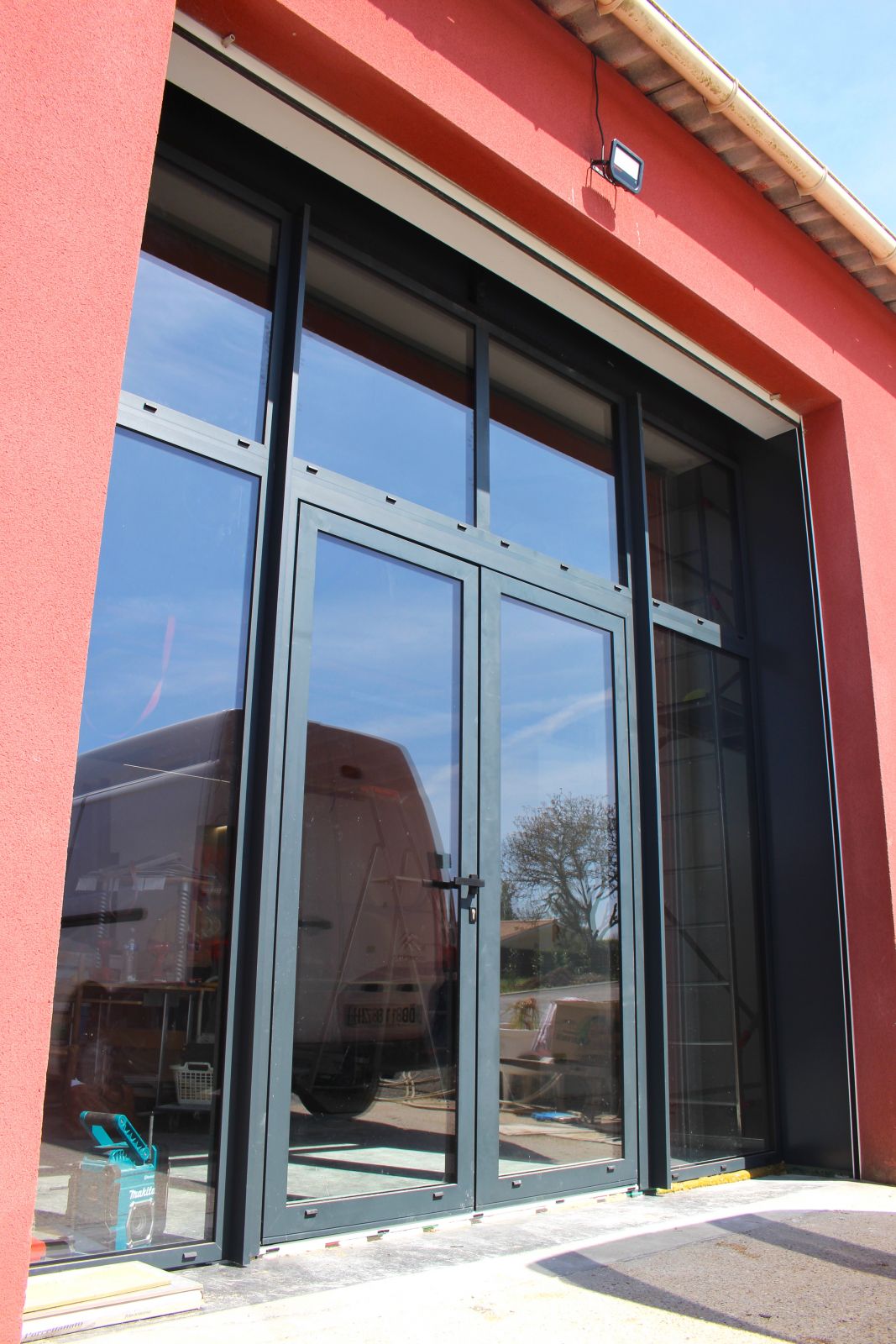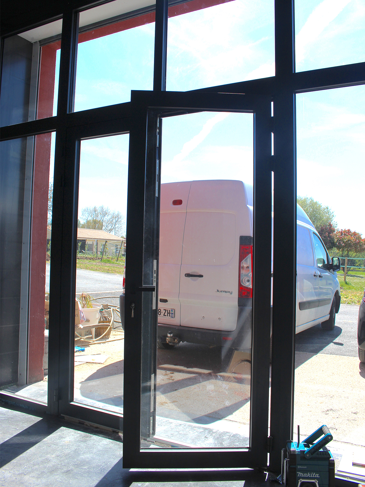 Nous avons posé un mur rideau avec porte d'entrée intégrée double vitrage retardateur d'effraction. RAL 7016 fine structure et baton de maréchal.