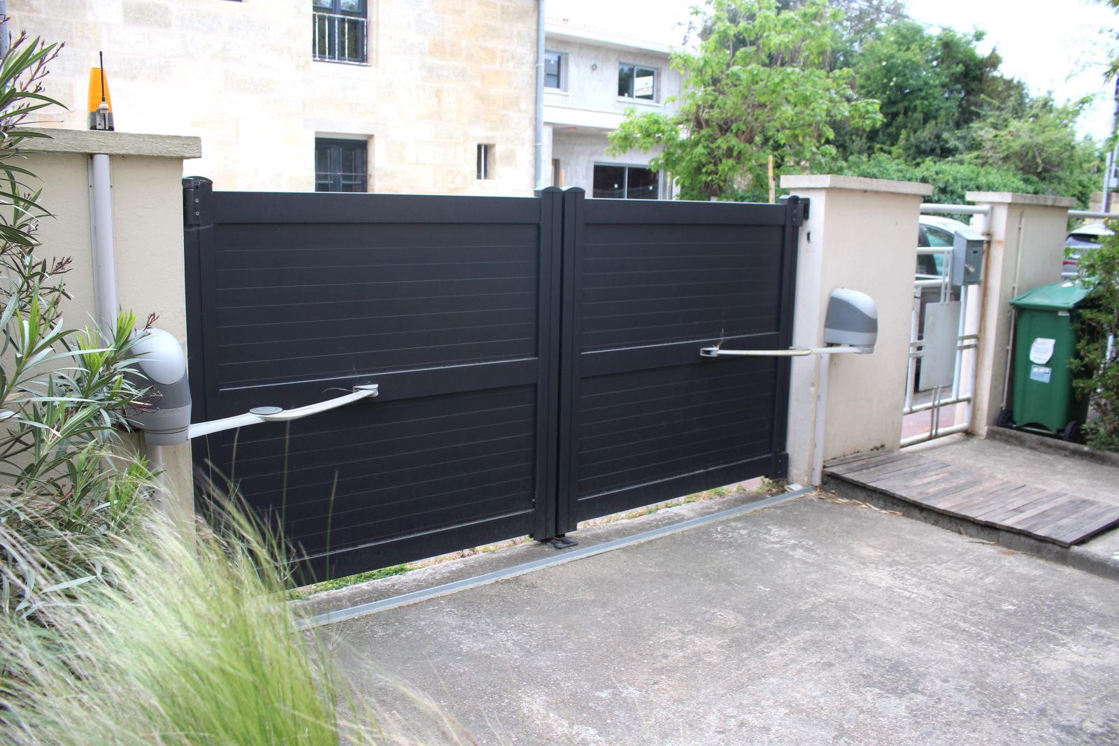 Nous avons posé une porte de garage sectionnelle à cassette RAL 9005 nervuré avec motorisation Somfy pro. Le portail est un portail style art déco motorisé avec portillon à gâches électriques.
