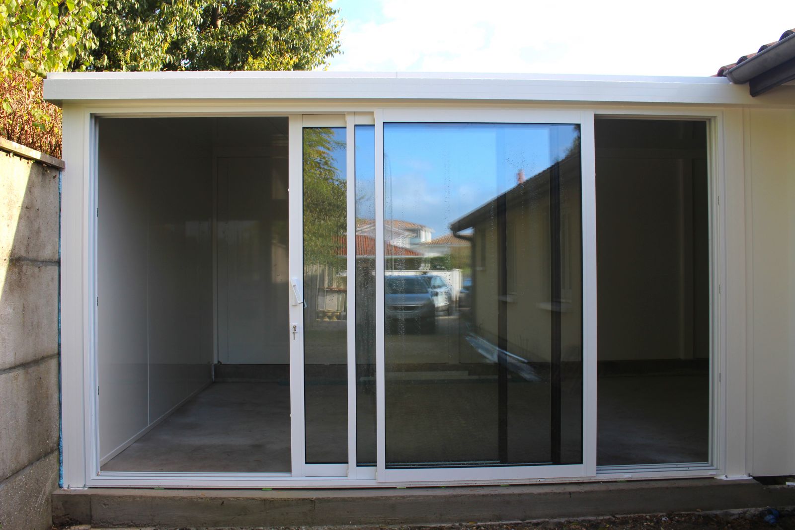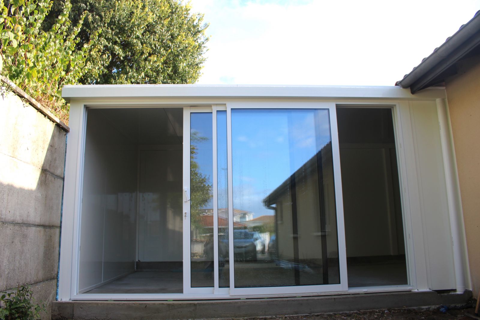 Cette extension de maison en ossature alu possède une isolation des murs par panneaux sandwich.