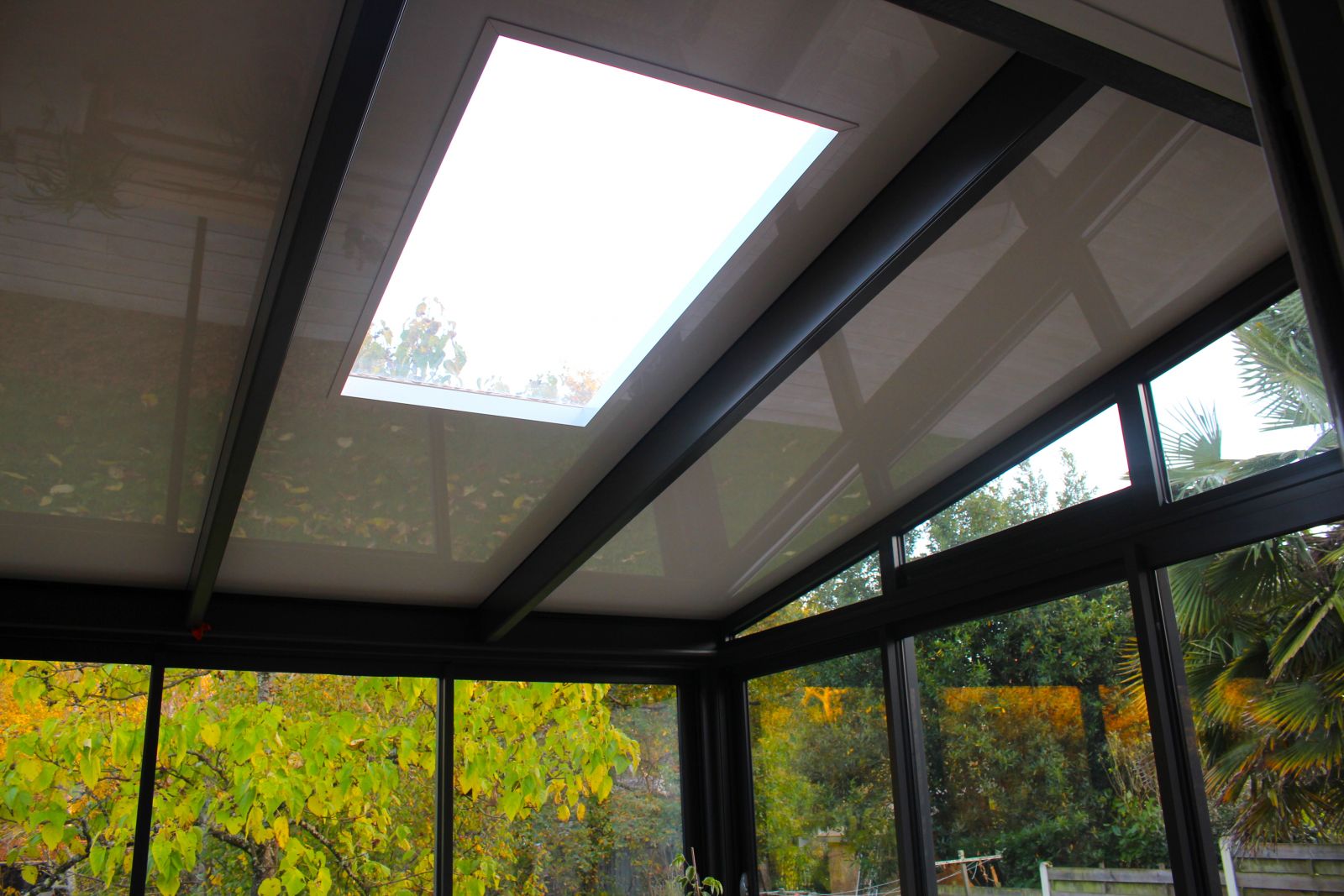 La véranda simple pente est posée sur une extension et possède deux puits de jours intégrés.