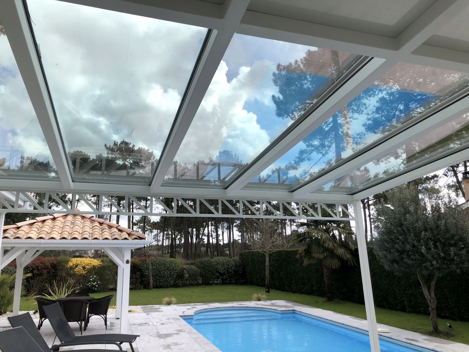 La pergola en acier est de couleur blanche. Elle possède des vitrages à protection solaire optimale SKN154 (IPN type eiffel).