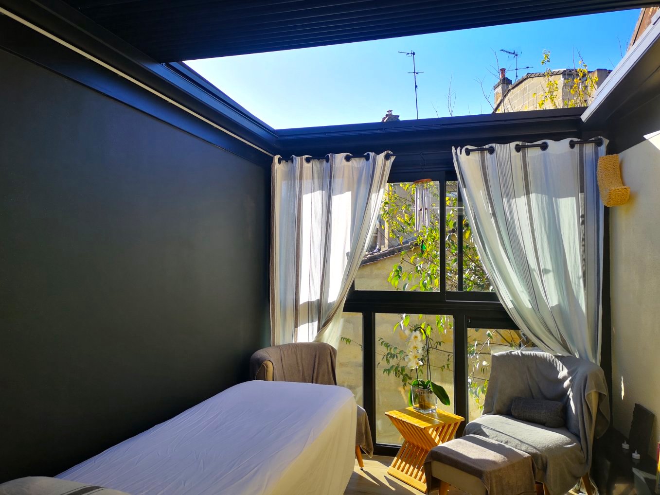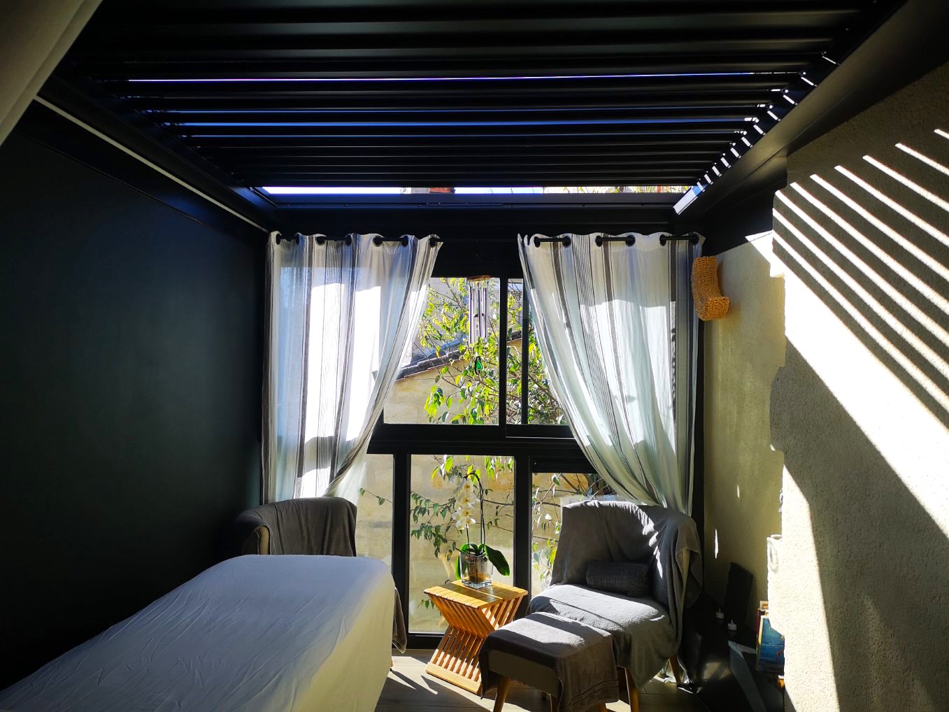L'Atelier de la création, spécialiste en menuiseries extérieures en Gironde a réalisé la conception et pose d'une véranda toit plat ainsi que d'une pergola bioclimatique à Bordeaux (33).