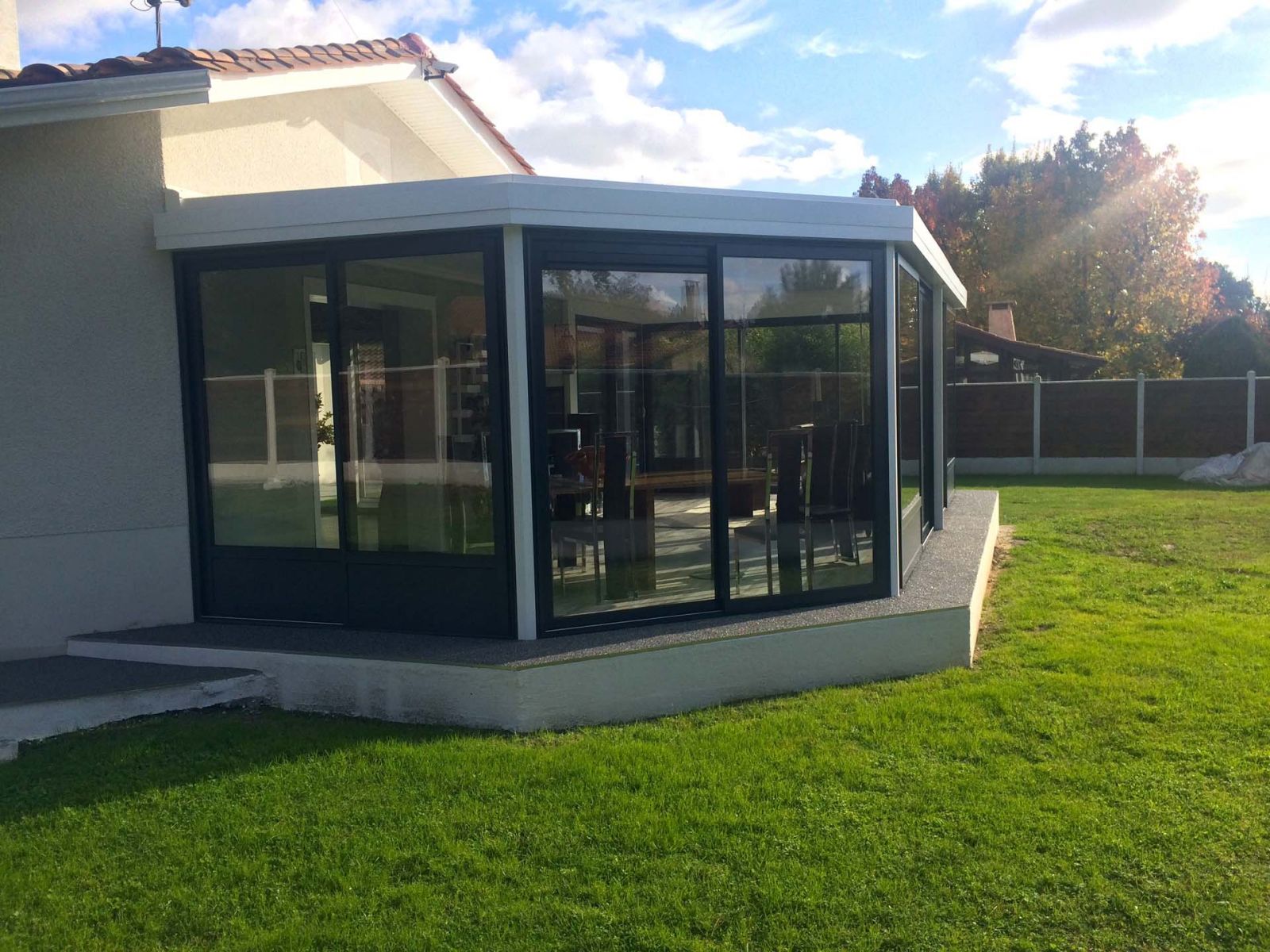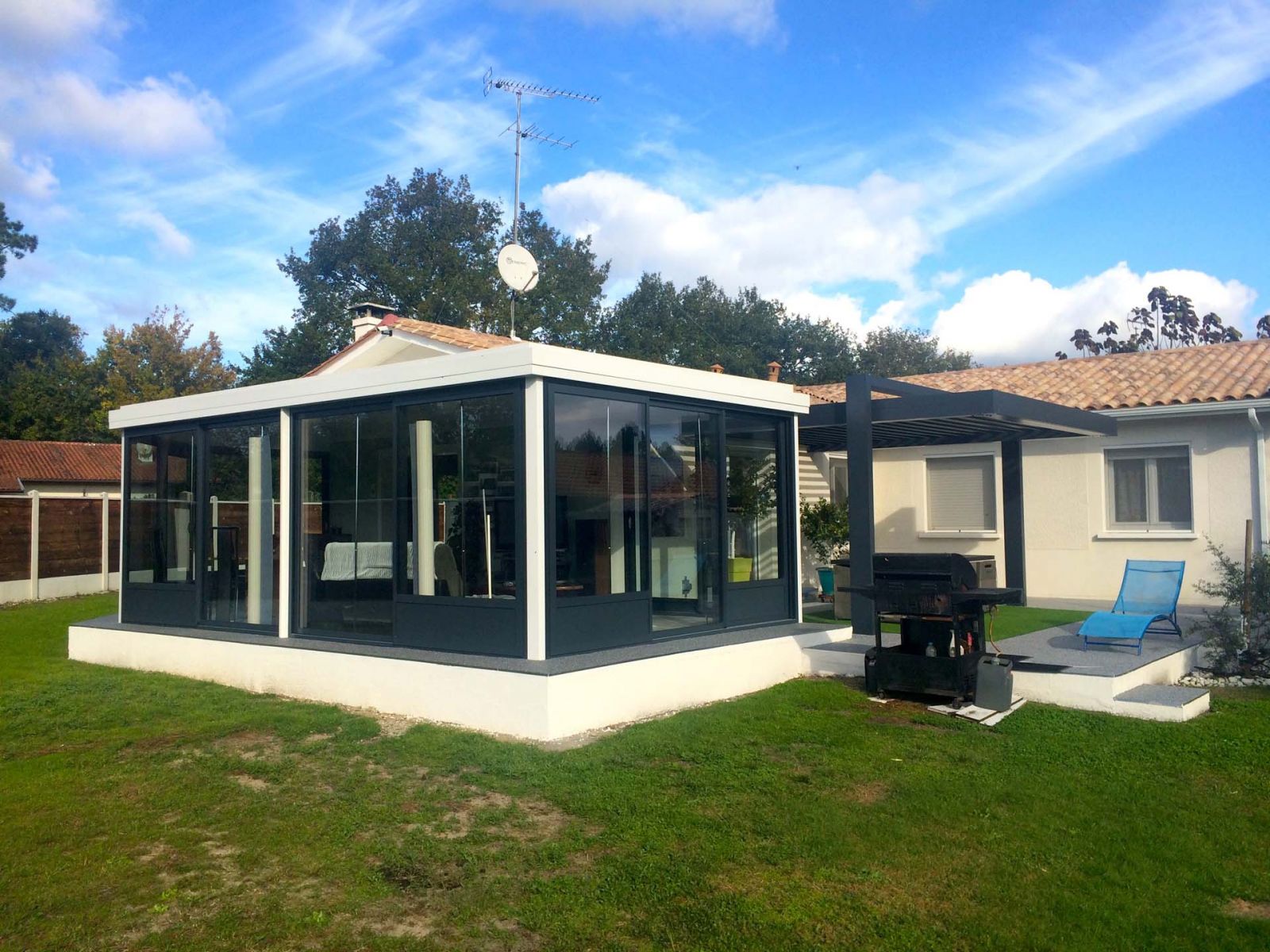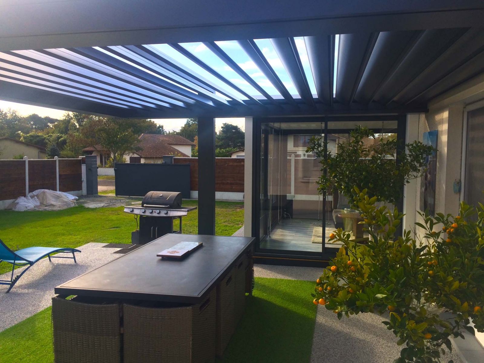 La pose de cette pergola bioclimatique et de cette véranda toit plat a été réalisée en 2020.