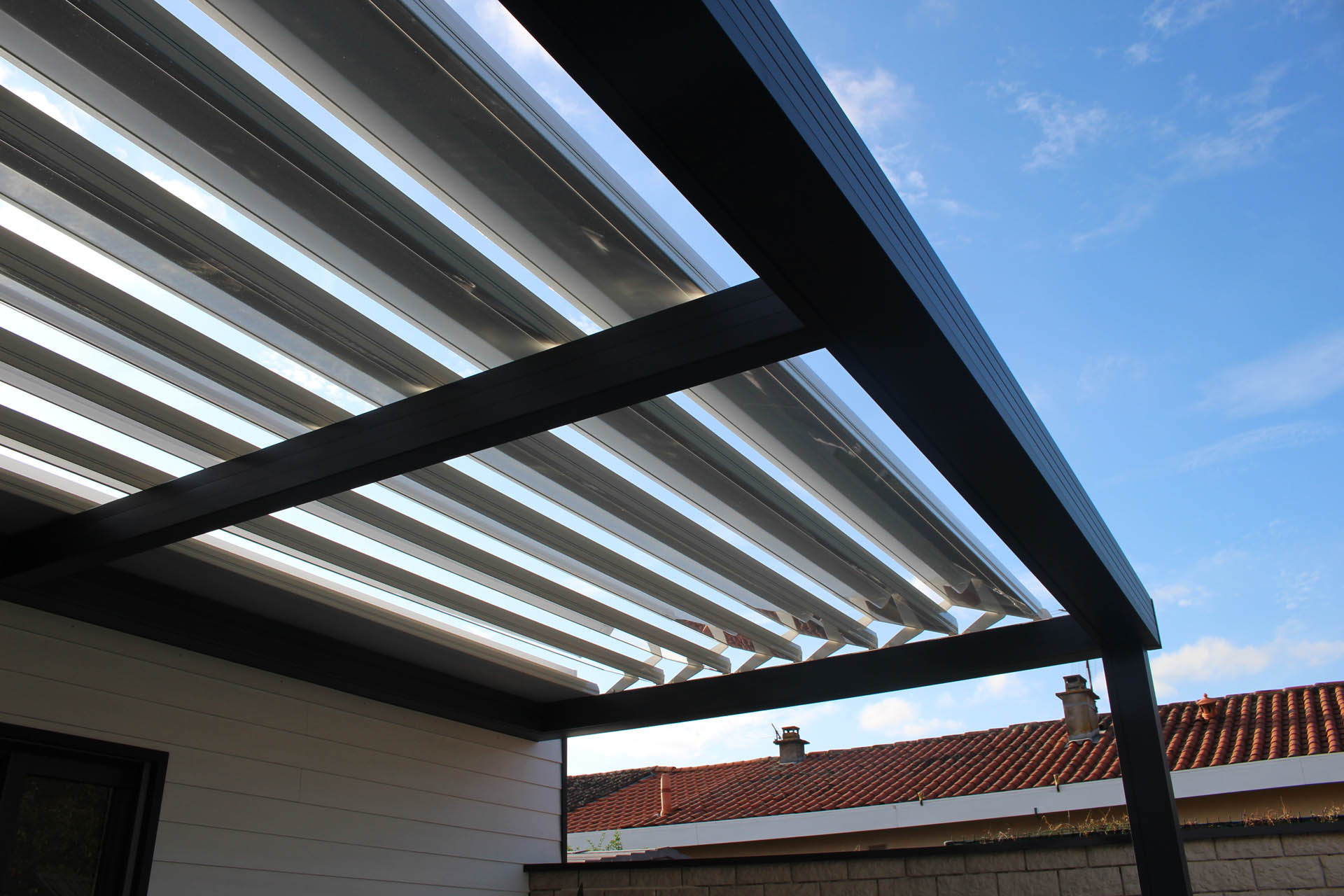 Cette pergola bioclimatique rétractable de 7,6m de long a été posée sans poteaux intermédiaires. Les lames sont en panneaux sandwich isolées ce qui permet à la pergola d’être 100% étanche à l’eau.