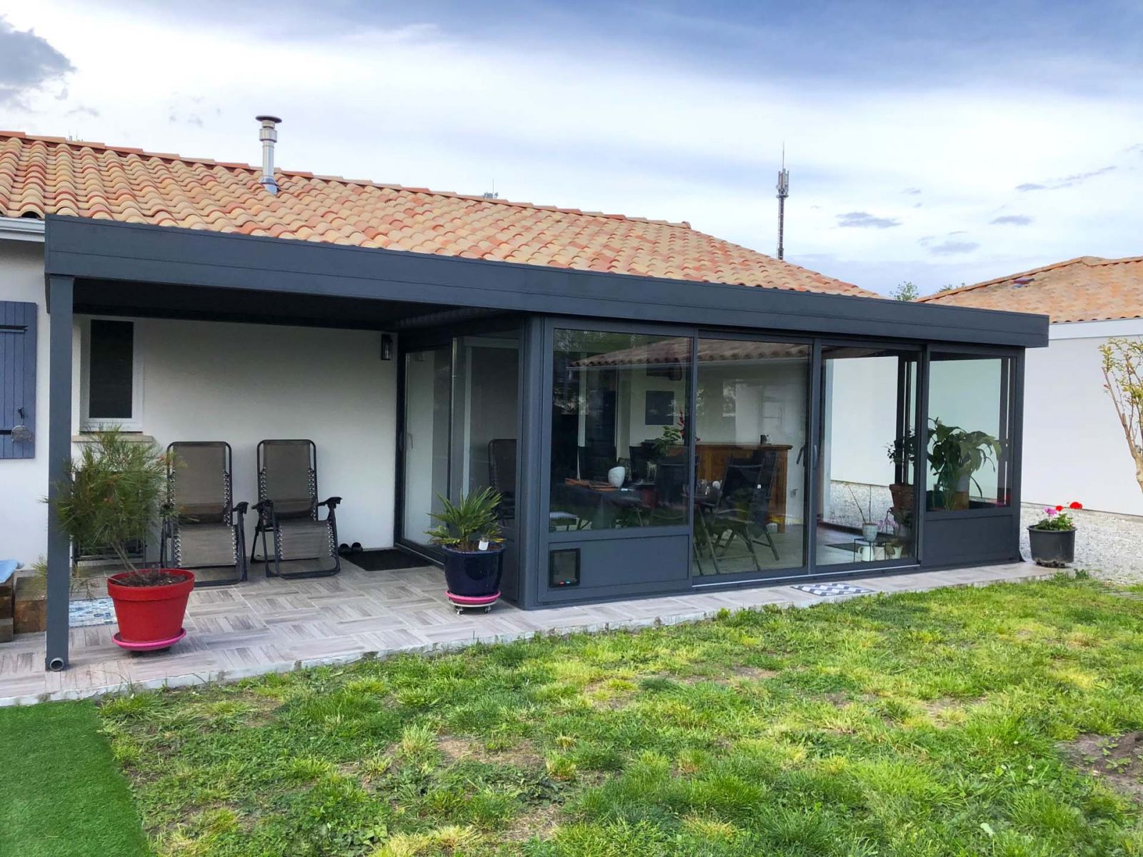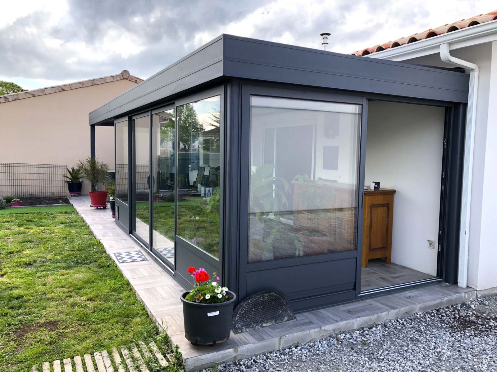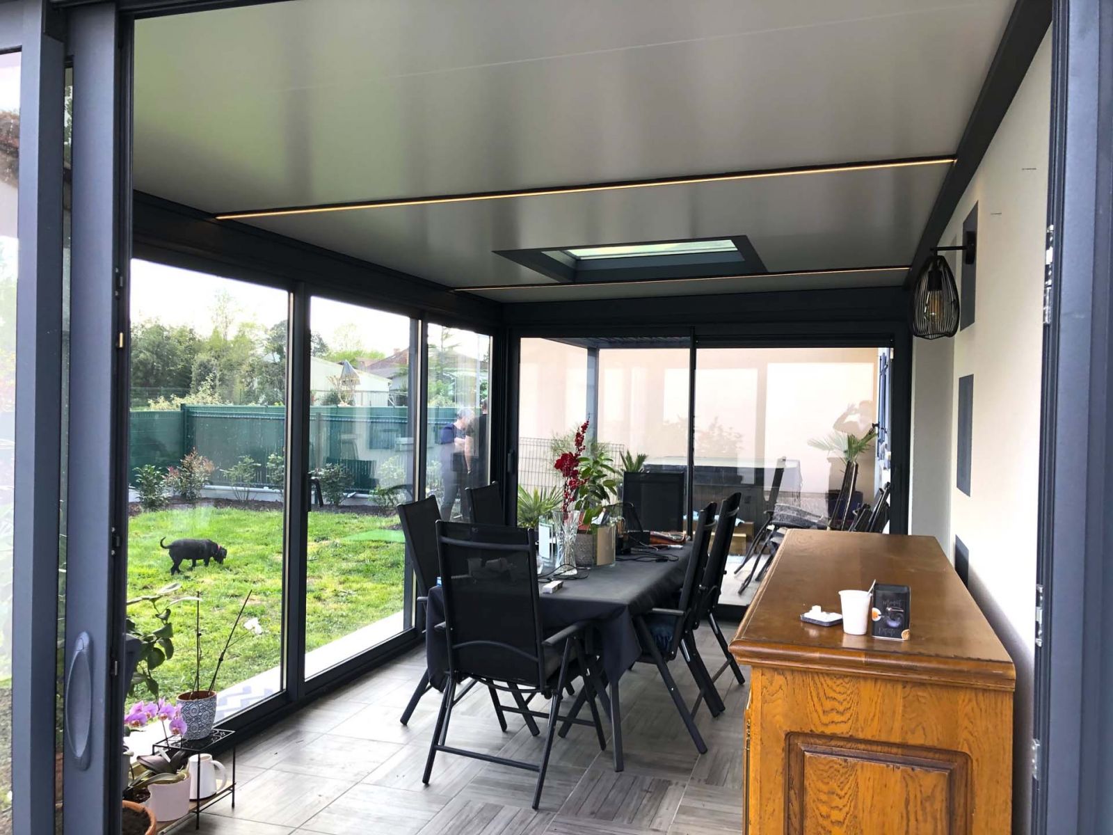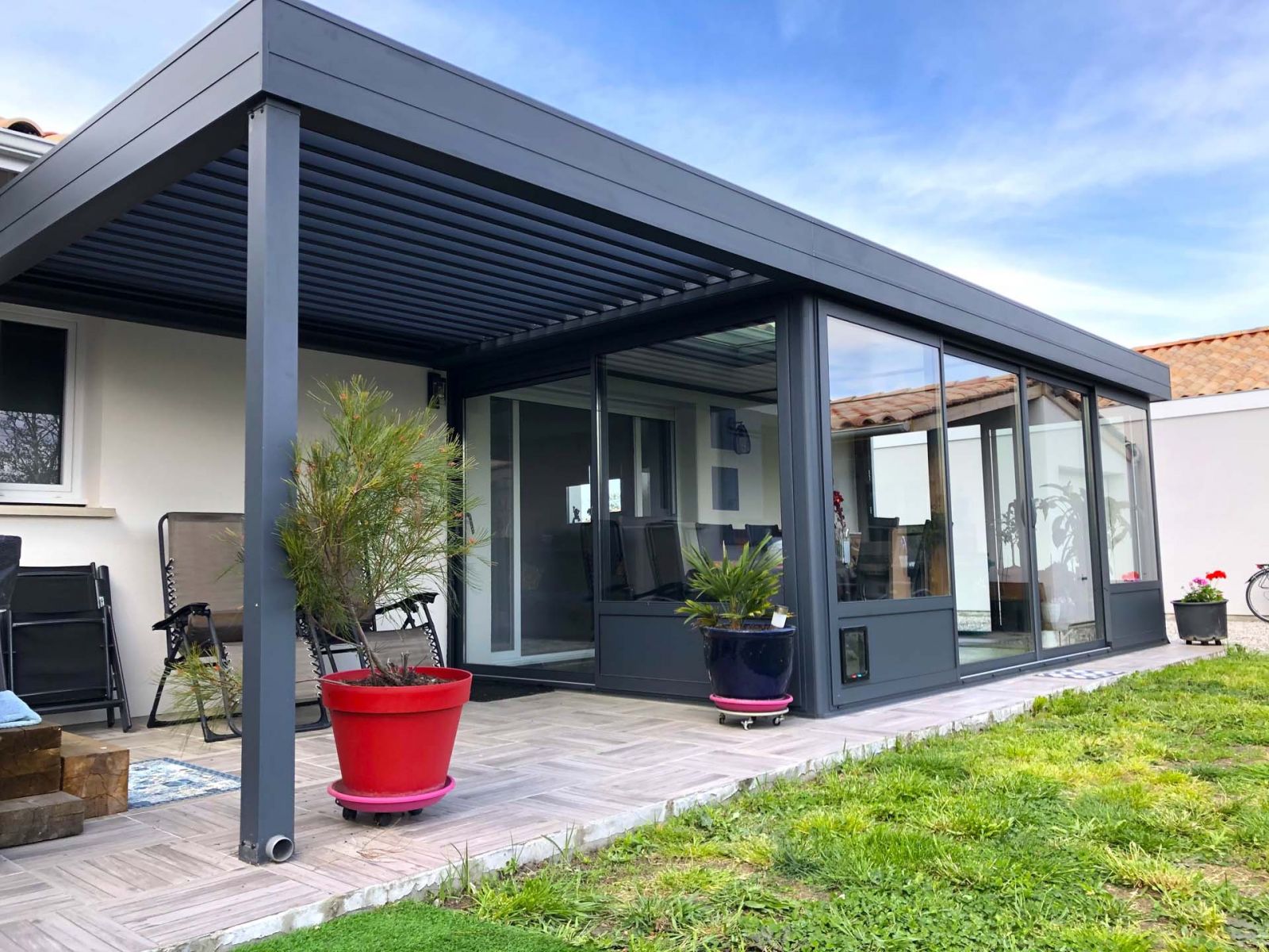 La véranda toit plat possède des puits de jour ainsi qu'une pergola bioclimatique adossée. Le tout de couleur gris anthracite.