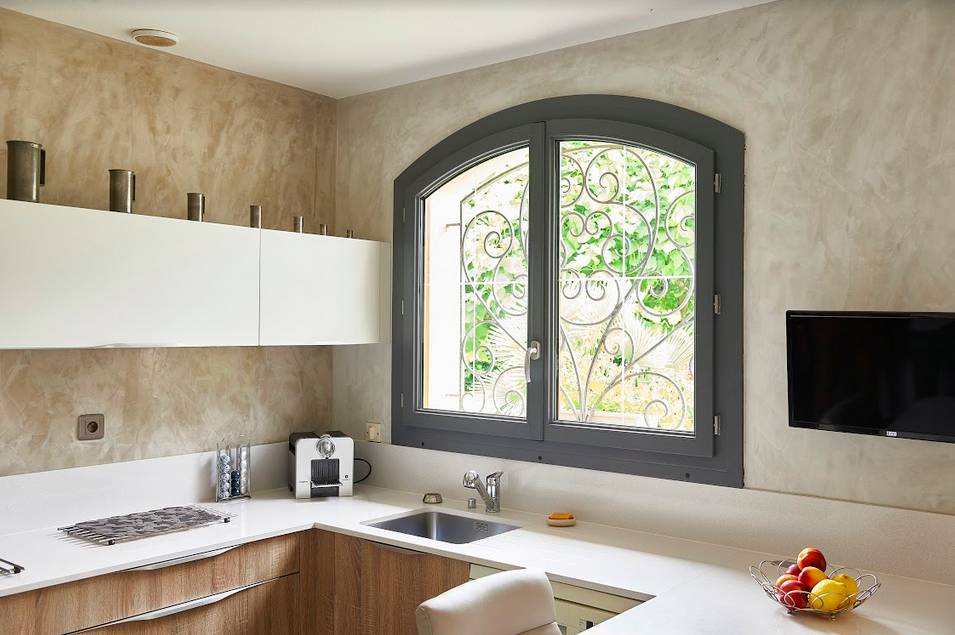 Les fenêtres en PVC sont en imitation bois de couleur gris antracite à l'extérieur et beige à l'intérieur.