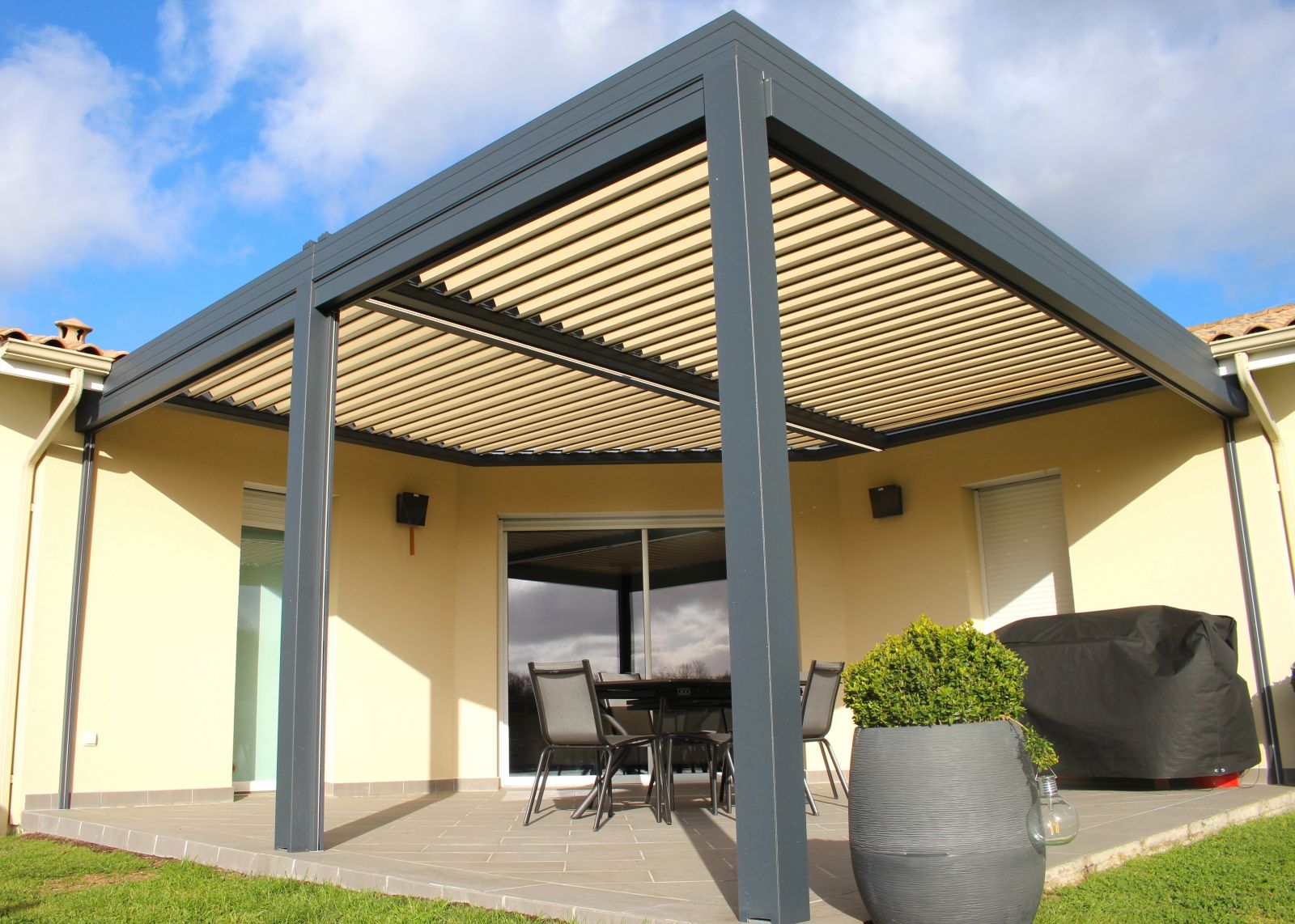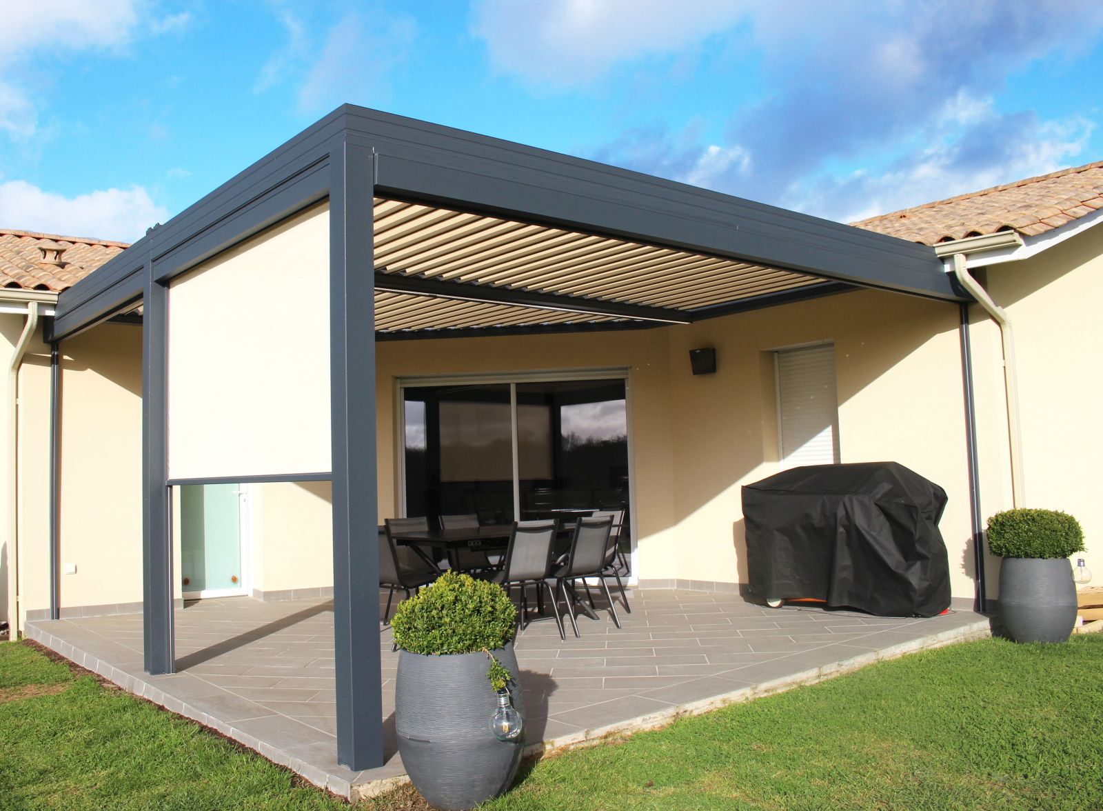 L'Atelier de la création, spécialiste en menuiseries extérieures en Gironde a réalisé la conception et pose d’une pergola bioclimatique trapézoïdale à CÉZAC (33).