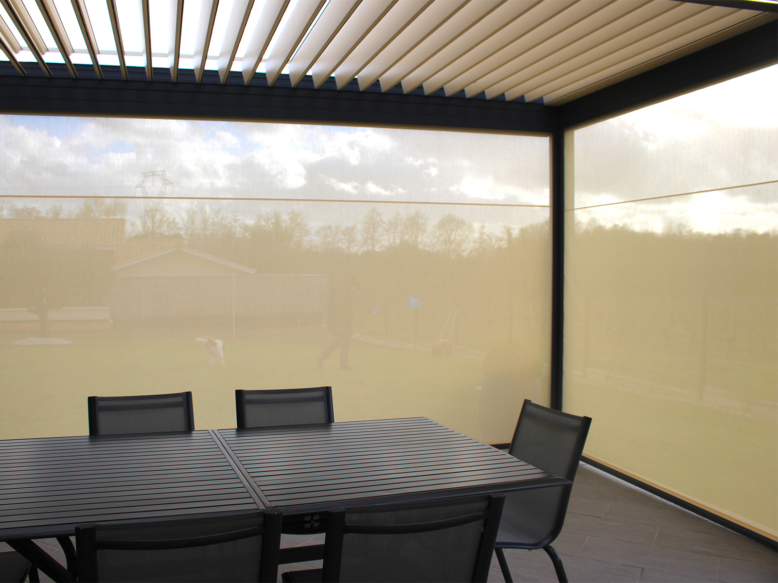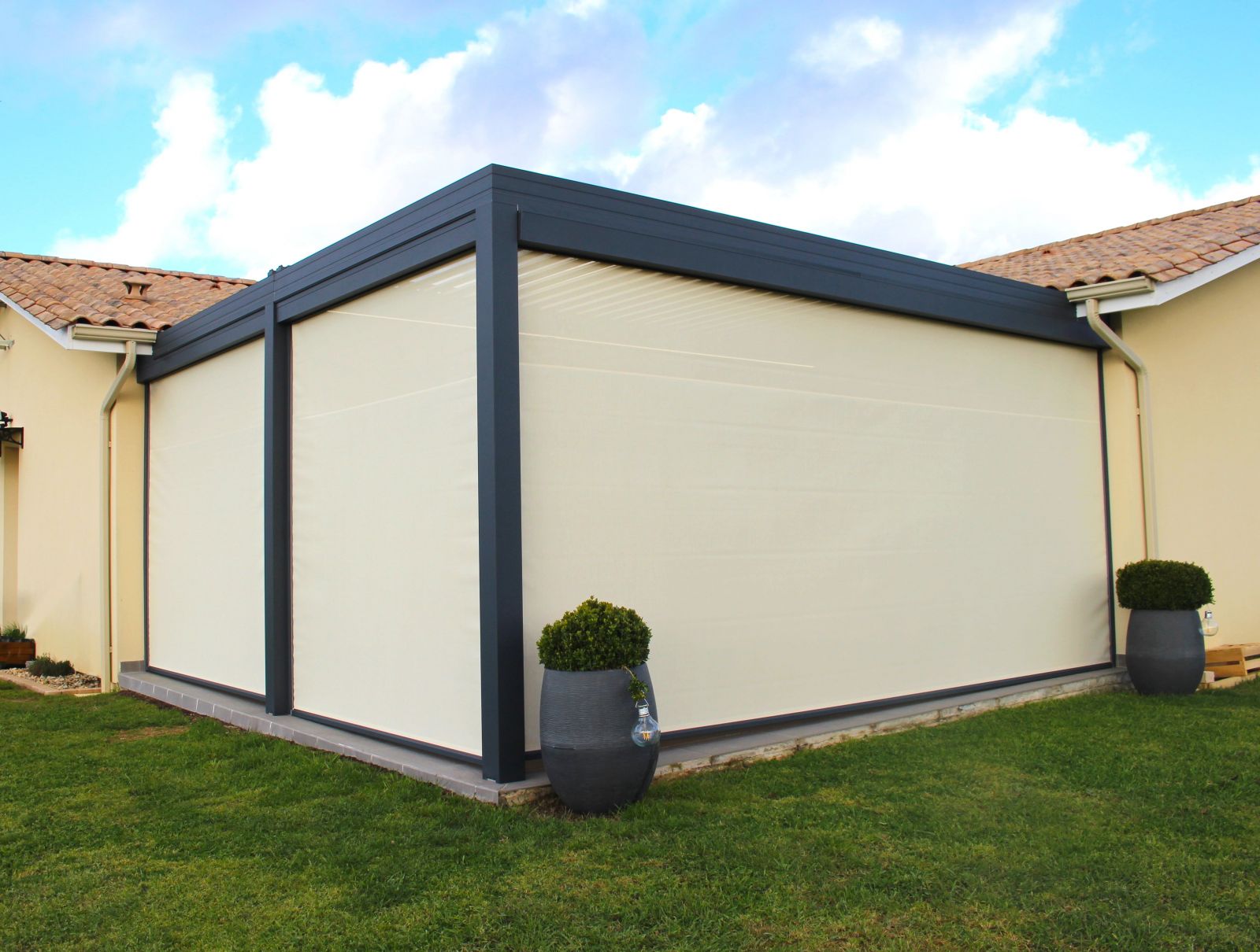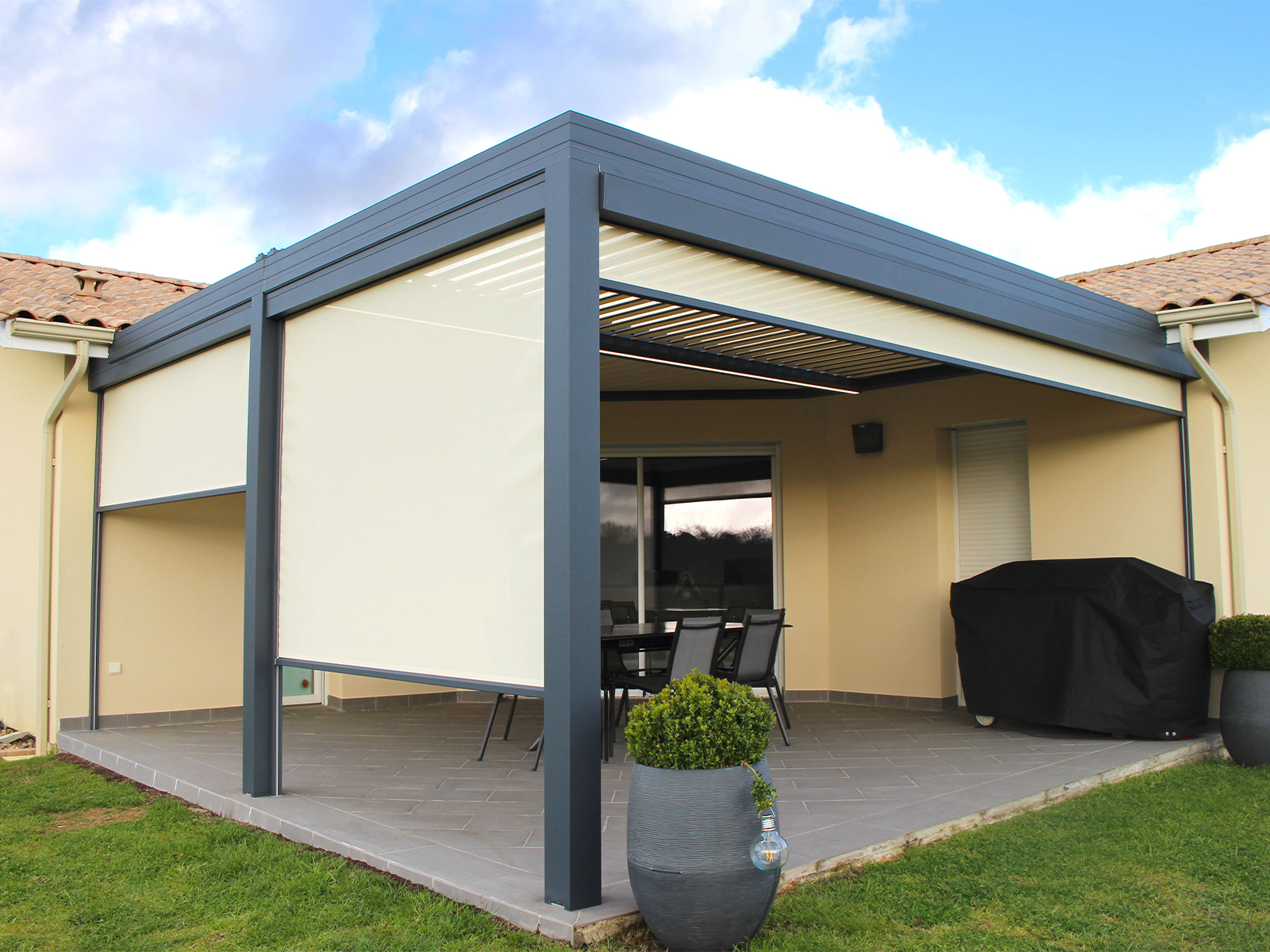 La pergola bioclimatique trapézoïdale est à reprise de niveau. Elle possède des LED ainsi que des stores intégrés. La structure est de couleur gris 7016 pailleté tandis que les lames sont de couleur 1015 granit.