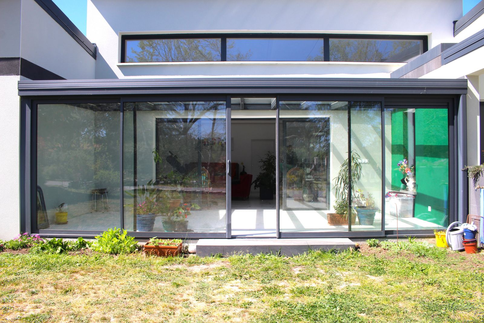 La véranda est une véranda de type toit plat en verre à pente faible (3%) couleur gris 7016 pailleté avec double vitrage anti effraction et spots intégrés. Elle possède des moulures contemporaines droites.