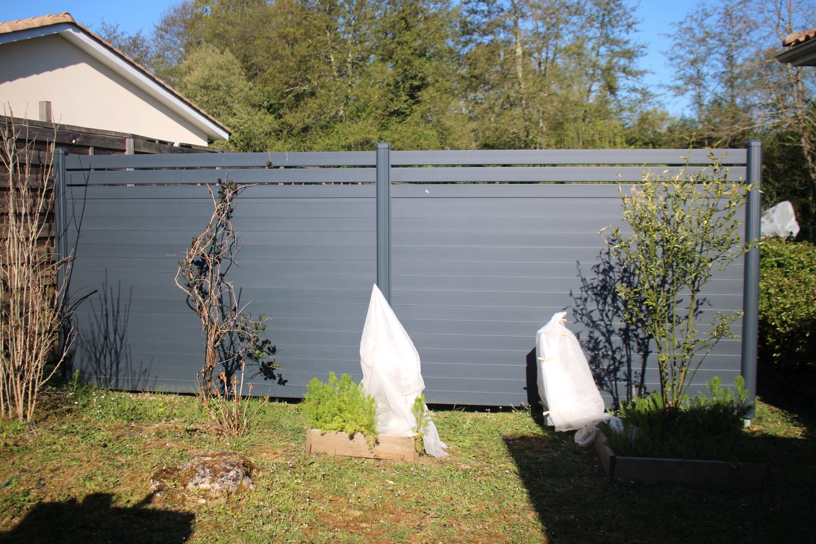 Nous avons posé des volets roulant solaires avec cellule déportée et grilles de défense. Nous avons aussi réalisé une clôture en aluminium sur semelle béton, couleur gris 7016, modèle "atelier de la création".