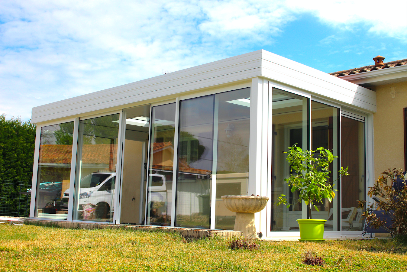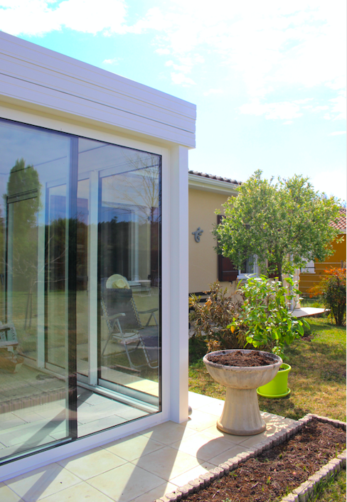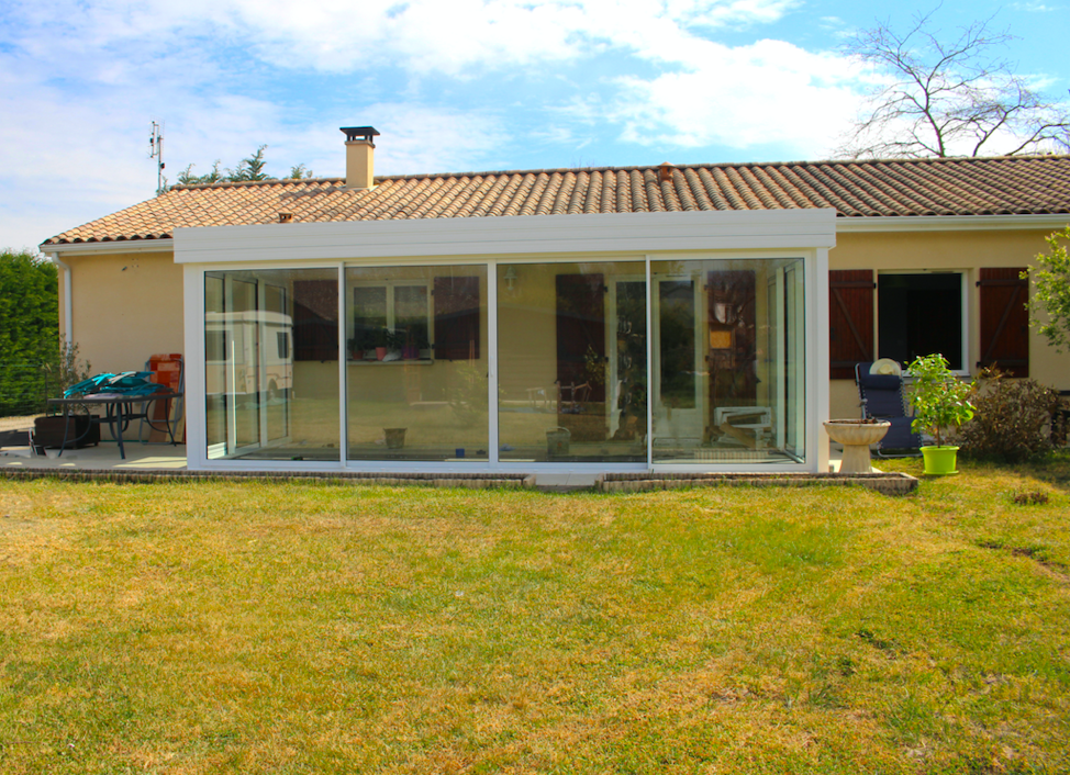 L'Atelier de la création, spécialiste en menuiseries extérieures en Gironde a réalisé la conception et pose d'une véranda toit plat avec deux puits de jour intégrés à VILLANDRAUT (33).