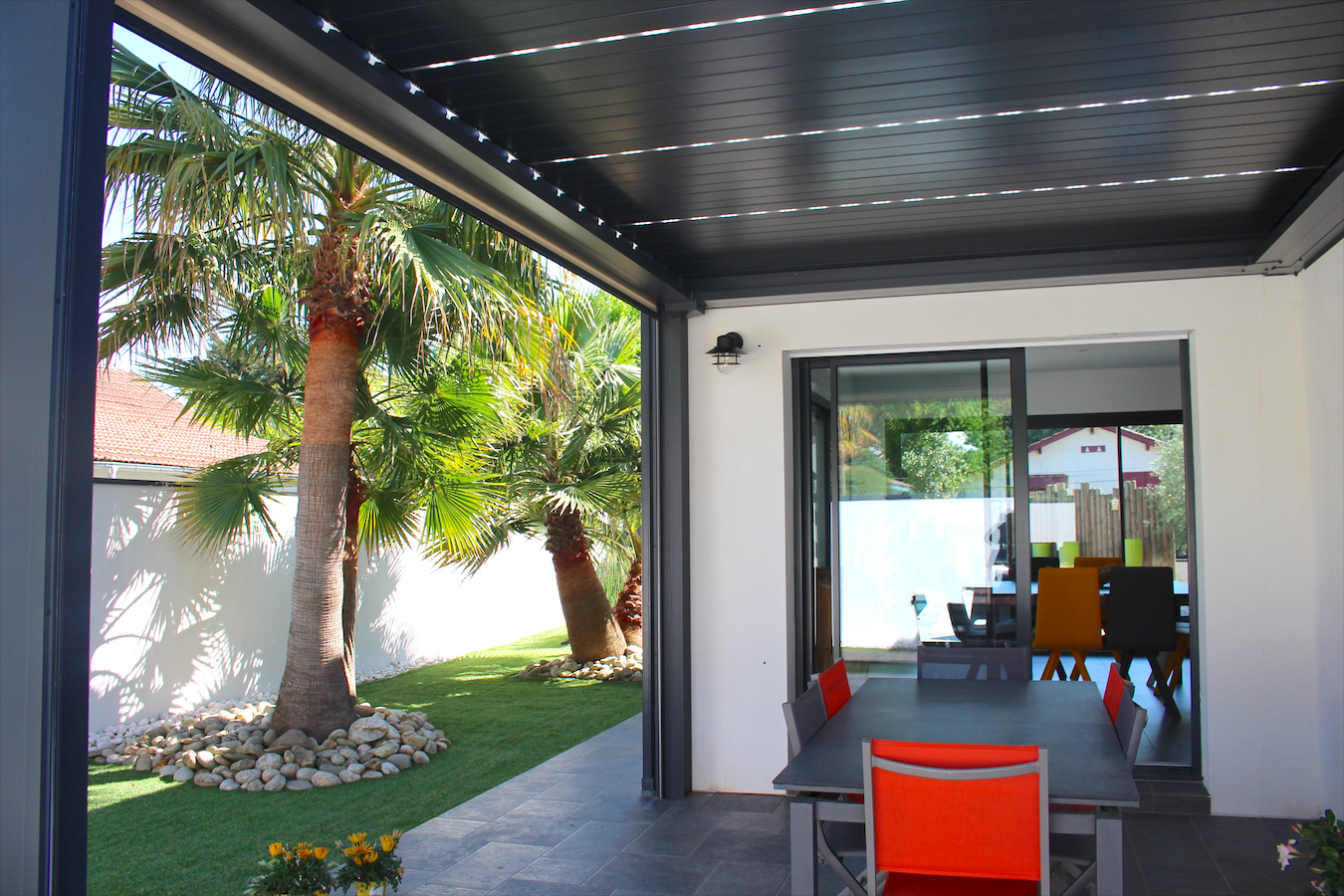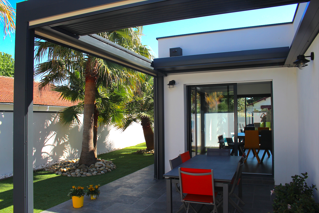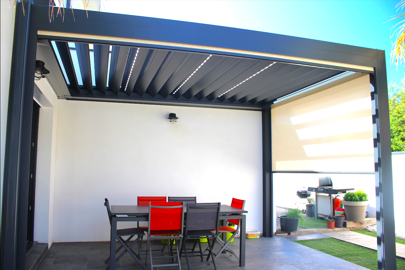 L'Atelier de la création, spécialiste en menuiseries extérieures en Gironde a réalisé la conception et pose d'une pergola bioclimatique rétractable avec leds et stores intégrés à LANTON (33).