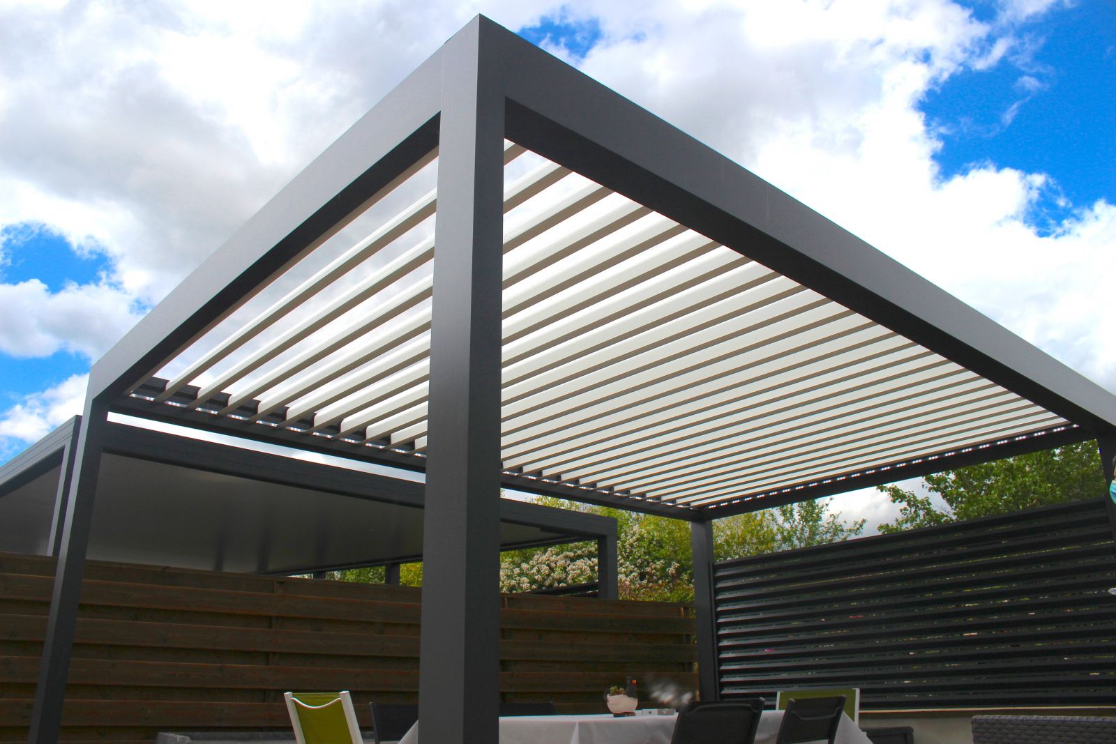 Nous avons posé une pergola bioclimatique orientable à lames blanches structure 7016 sur plots béton, le tout réalisé par nos soins.
