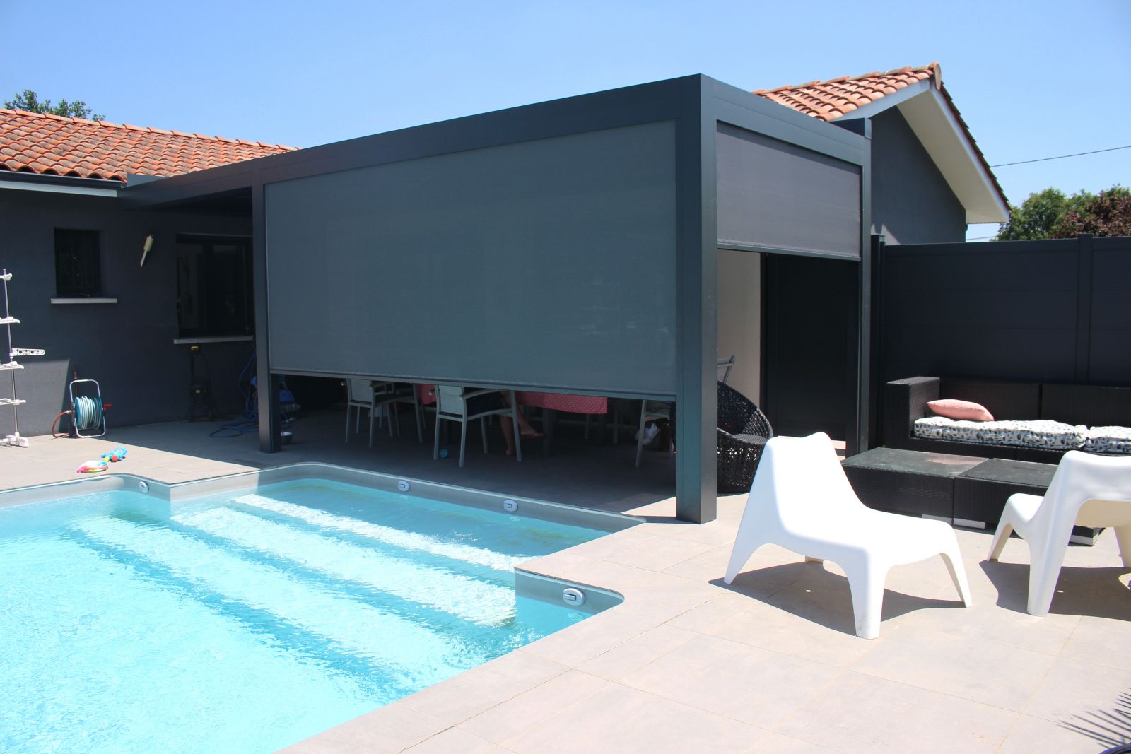 Nous avons posé une pergola biolcimatique double avec départ sur avant toit. Les stores sont intégrés ainsi que les leds .