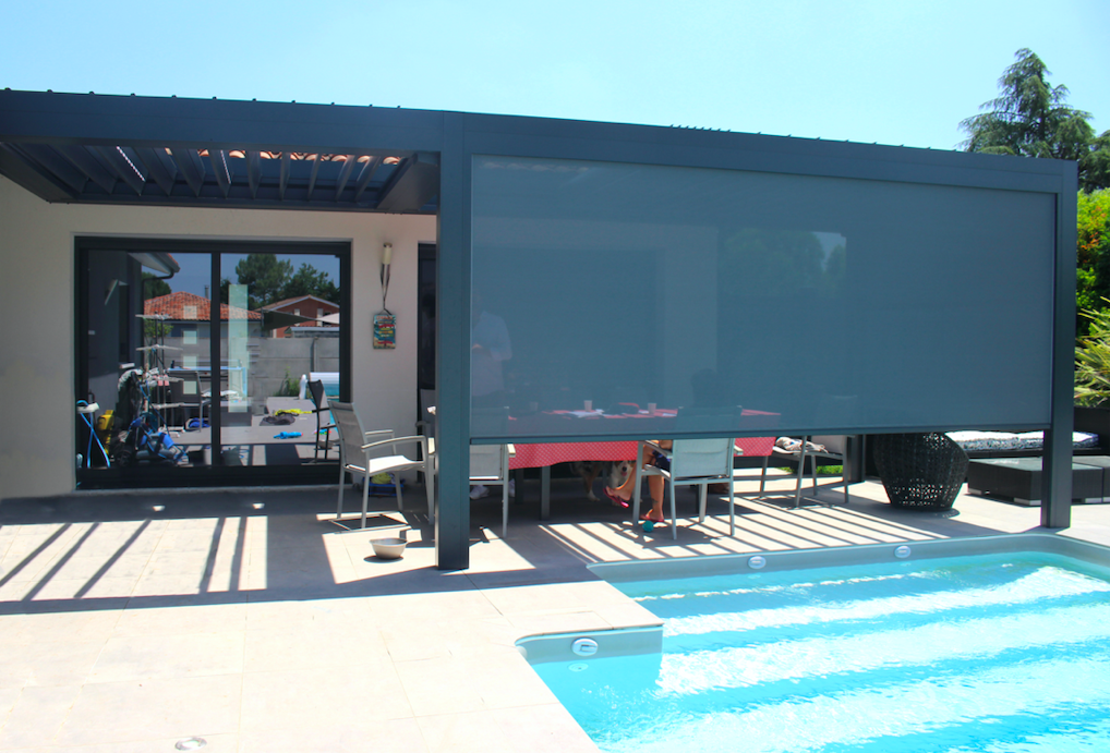 L'Atelier de la création, spécialiste en menuiseries extérieures en Gironde a réalisé la conception et pose d'une pergola bioclimatique double avec stores à SAINT CAPRAIS DE BORDEAUX (33).