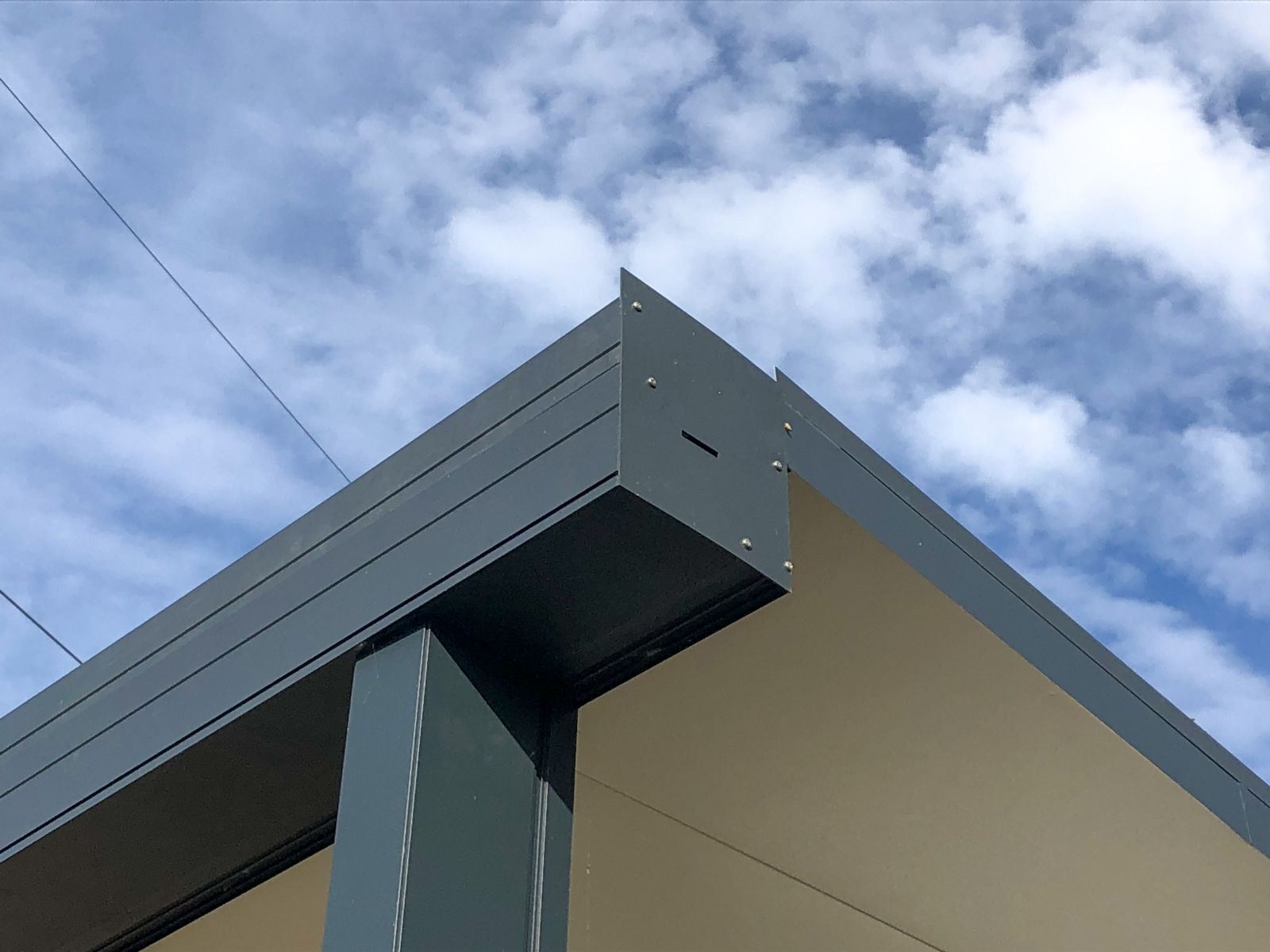 Nous avons posé un carport adossé en aluminium avec pente douce en panneaux sandwich, de couleur gris 7016.