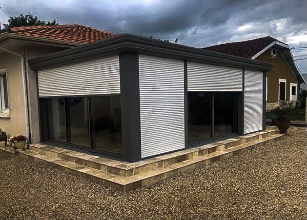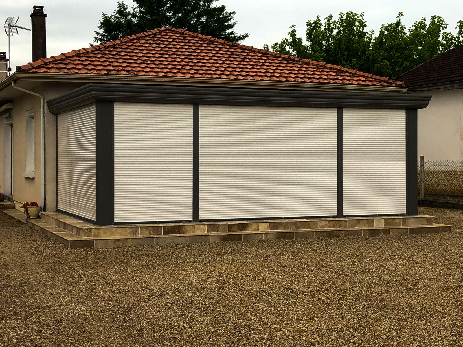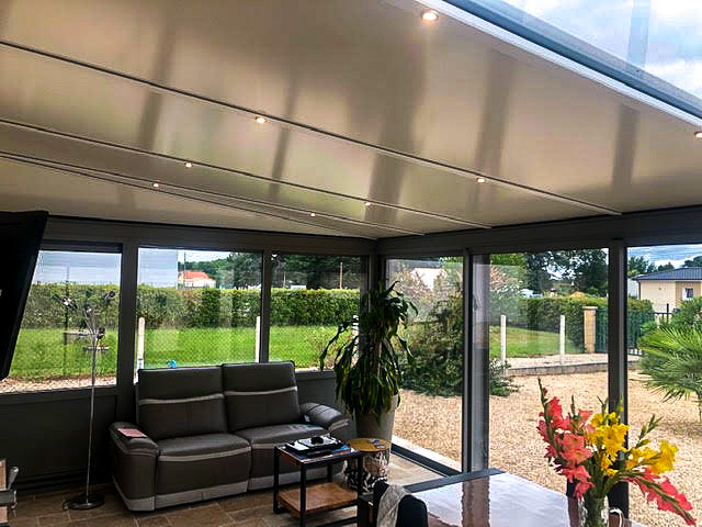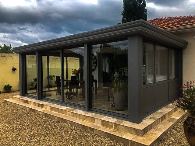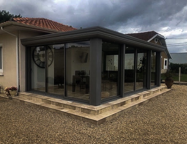 L'Atelier de la création, spécialiste en menuiseries extérieures en Gironde a réalisé la conception et pose d'une véranda en aluminium à pans couchés avec puit de jour intégré à SAINT-SEURIN SUR L'ISLE (33).Nous avons posé une véranda en alu à rupture de pont thermique avec un double pans couchés lateral.
