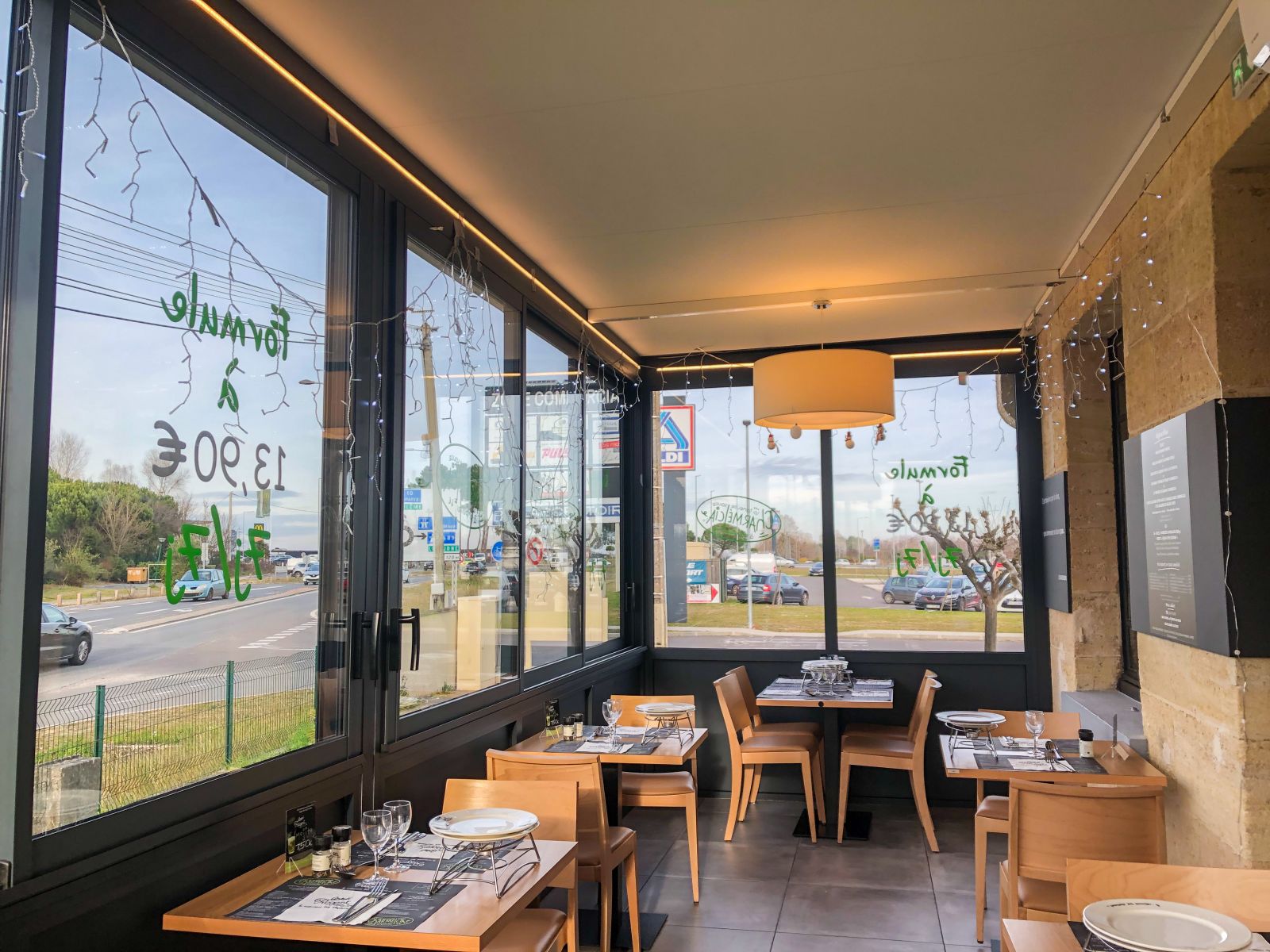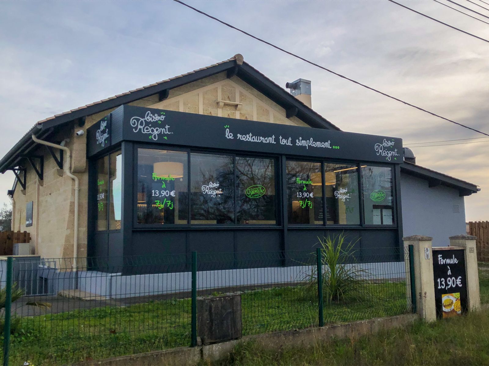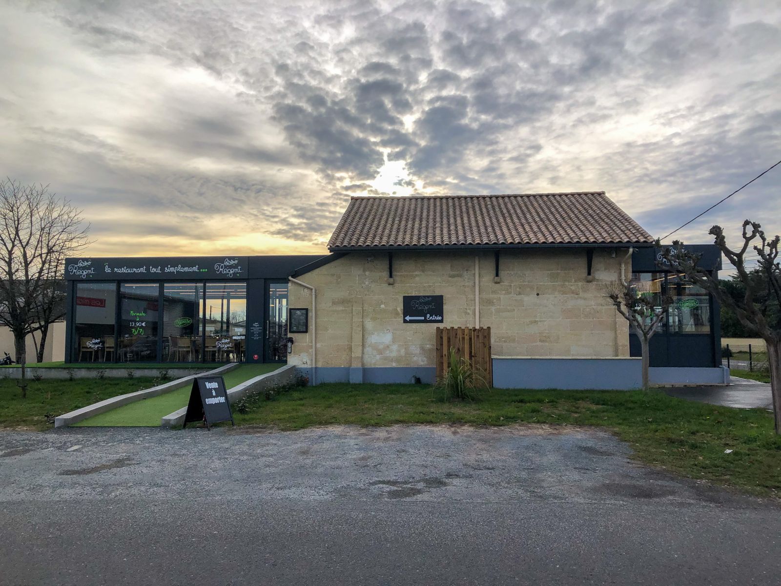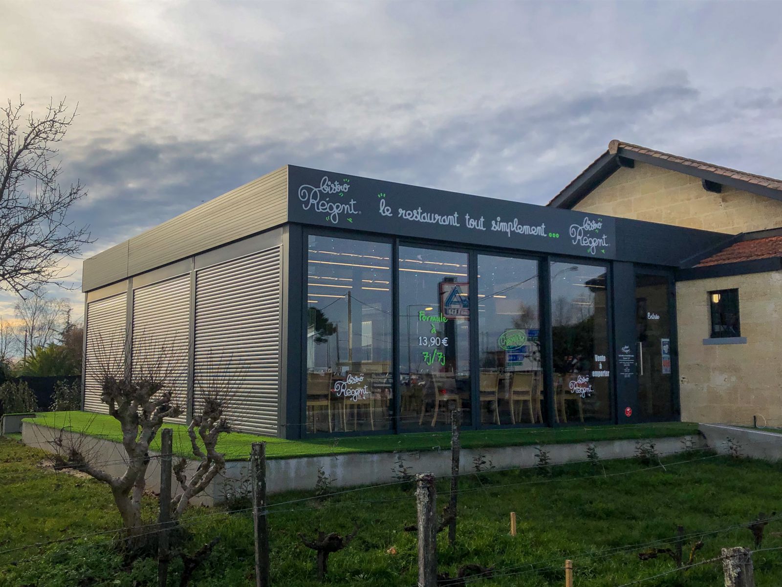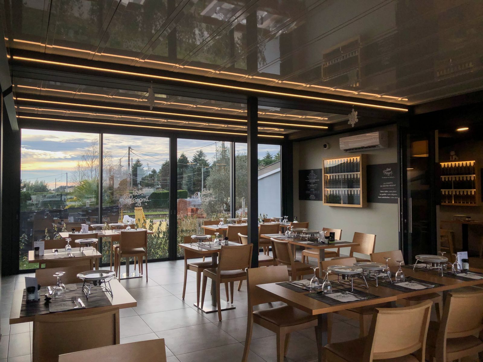 L'Atelier de la création, spécialiste en menuiseries d'extérieures en Gironde, a réalisé la conception et la pose d'une véranda décapotable ainsi que d'une véranda toit plat pour le Bistro Régent de Saint-André-de-Cubzac (33).