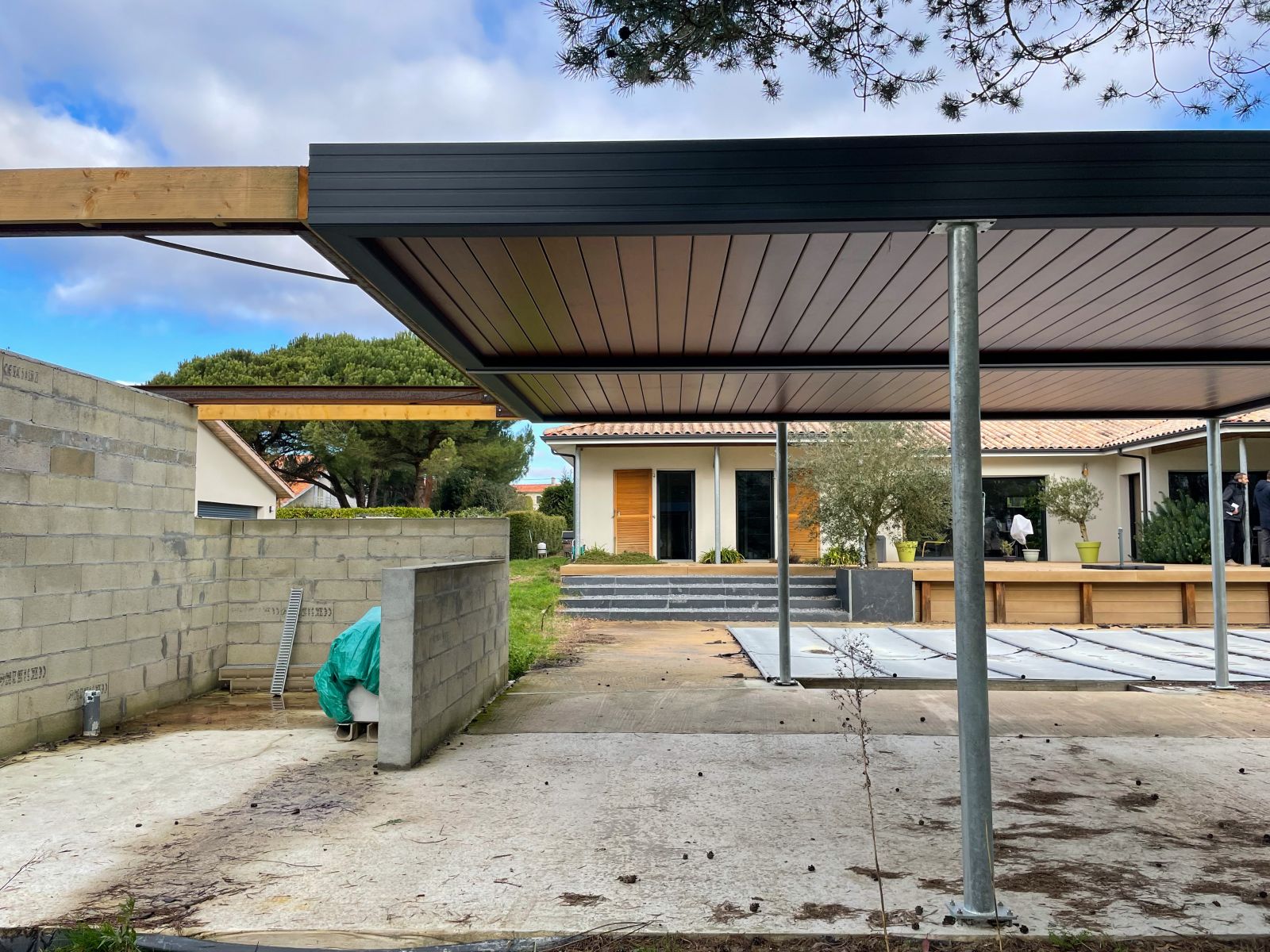 L'Atelier de la création, spécialiste en menuiseries extérieures en Gironde a réalisé la conception et pose d'une double pergola bioclimatique à lames double peau orientables et rétractables, à PEUJARD (33).