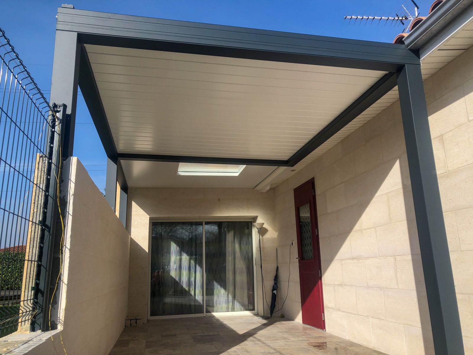 Concernant le sas d'entrée accolé à la pergola, nous y retrouvons un puit de jour à plat fixe, ainsi qu'une toiture en panneaux sandwich isolants.- Couleur armature : Gris anthracite mat 7016