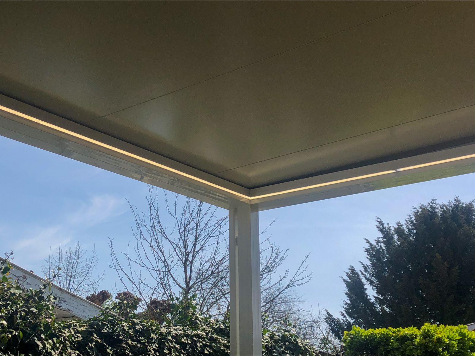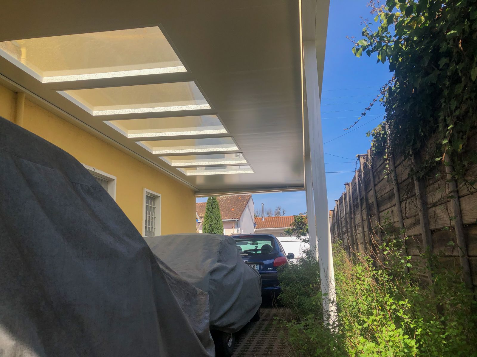 Nous avons posé un carport adossé en aluminium avec pente douce en panneaux sandwich, de couleur blanc 9016.
