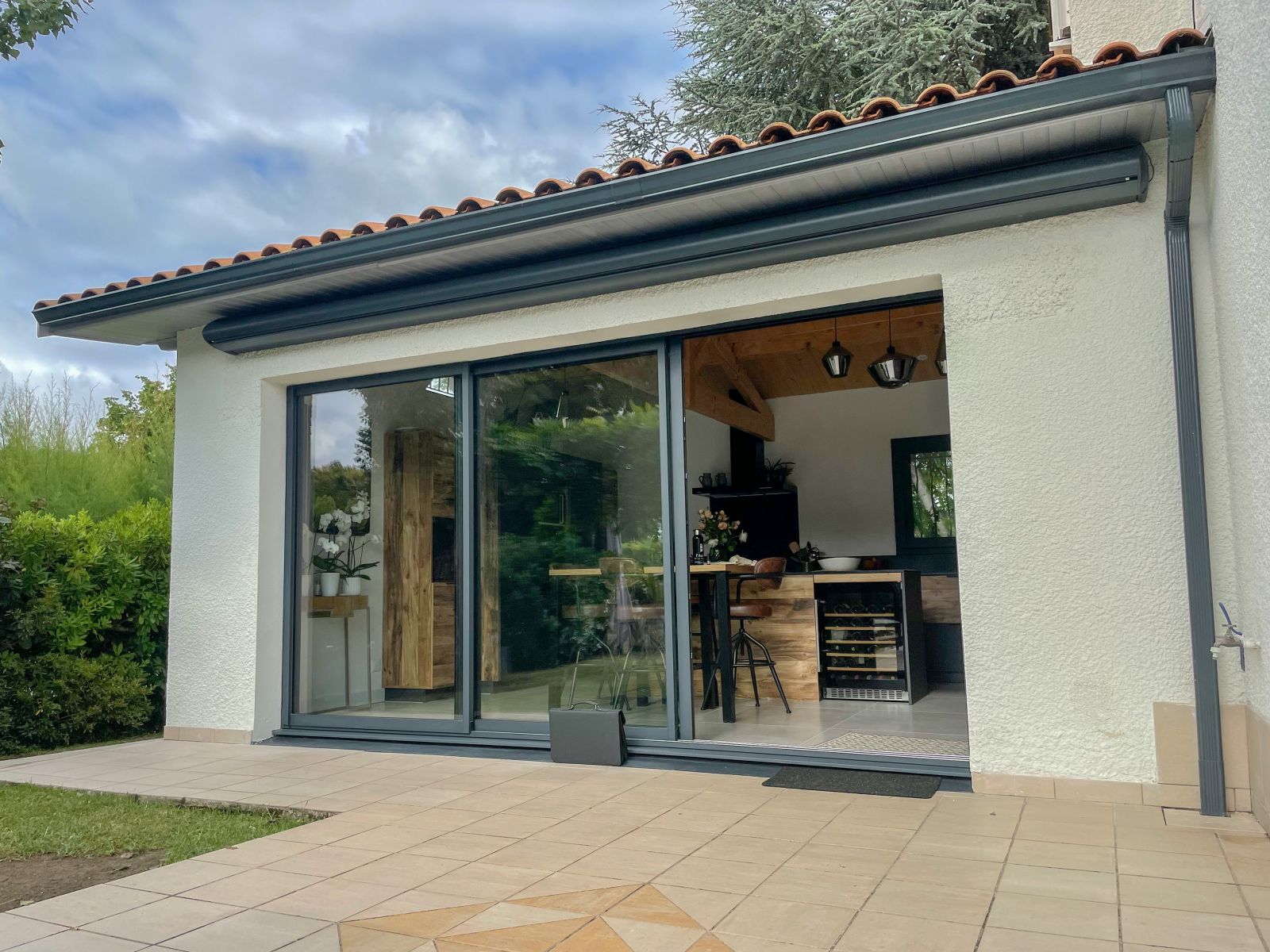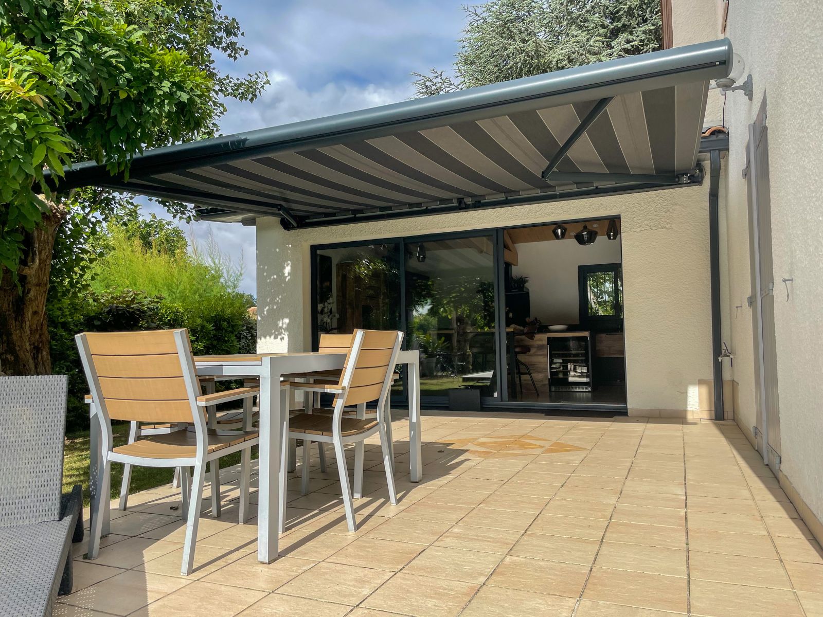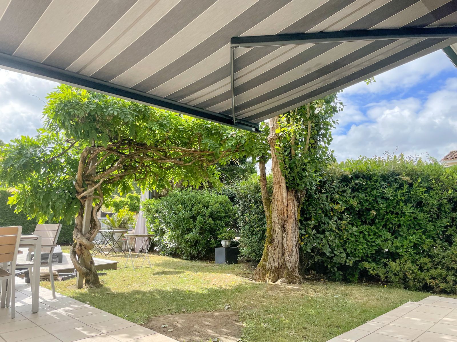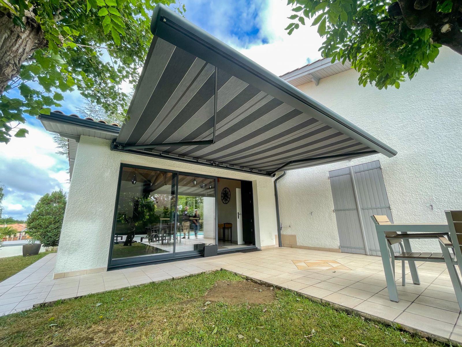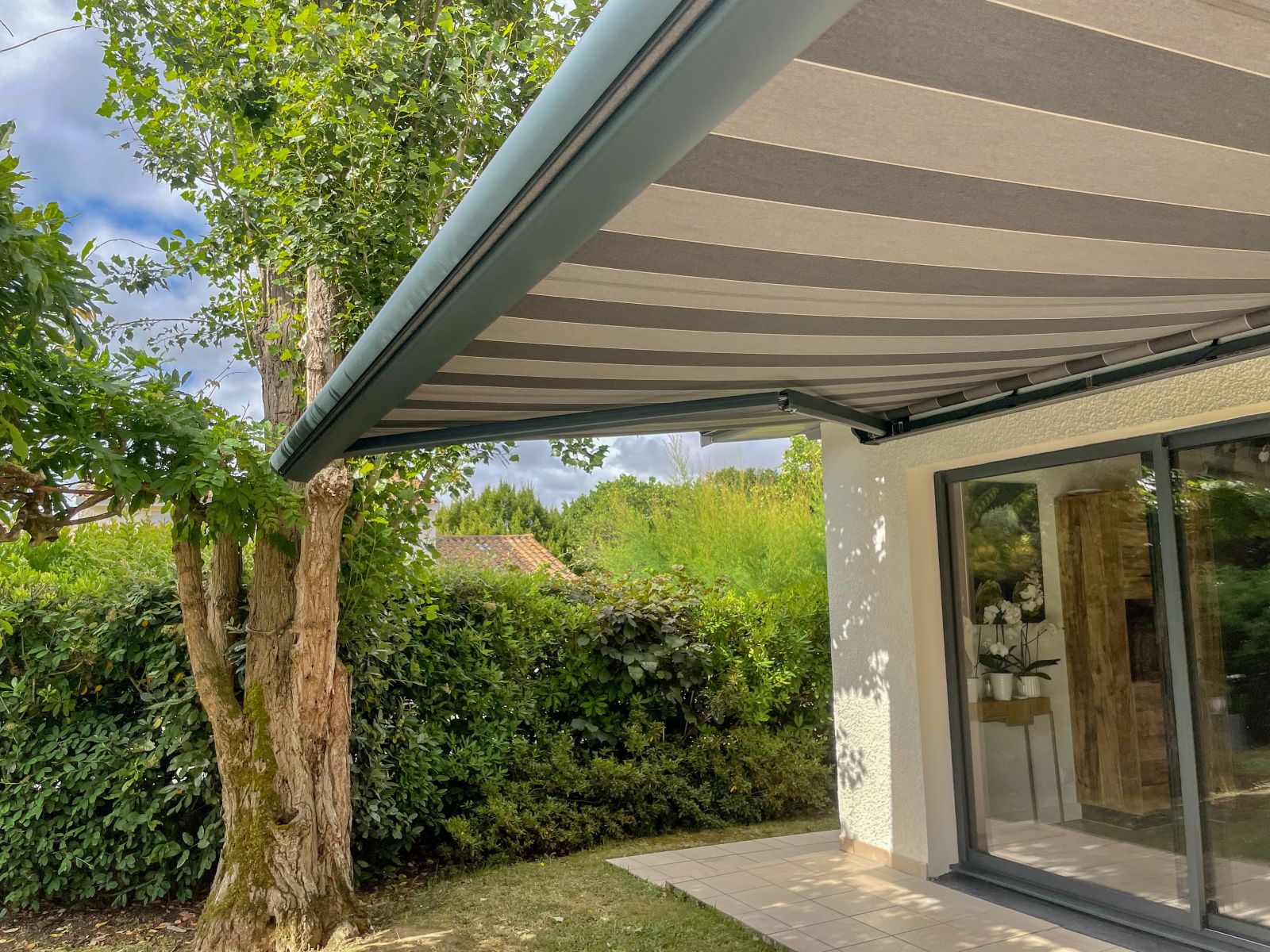 L'Atelier de la création, spécialiste en menuiseries extérieures en Gironde a réalisé la conception et la pose d'un store banne avec coffre et lambrequin motorisé à ARTIGUES-PRES-BORDEAUX (33).