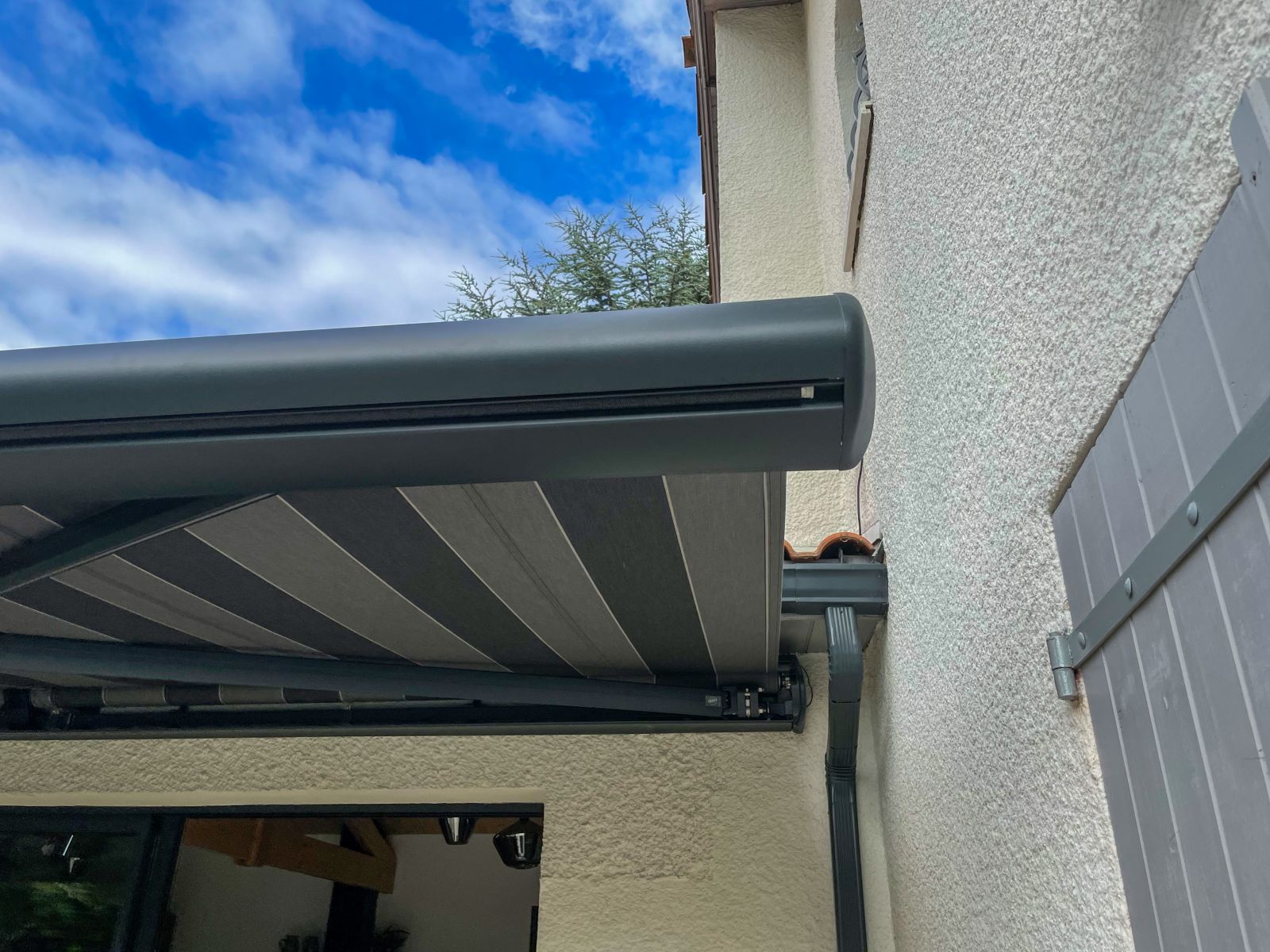 Nous avons posé un store banne qui dispose d'un coffre motorisé ainsi que d'un lambrequin enroulable motorisé. Celui-ci se règle à l'aide d'une télécommande radiocommandée.- Couleur toile : Rayée de nuances de gris