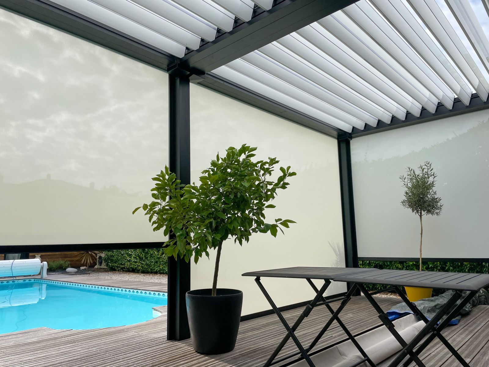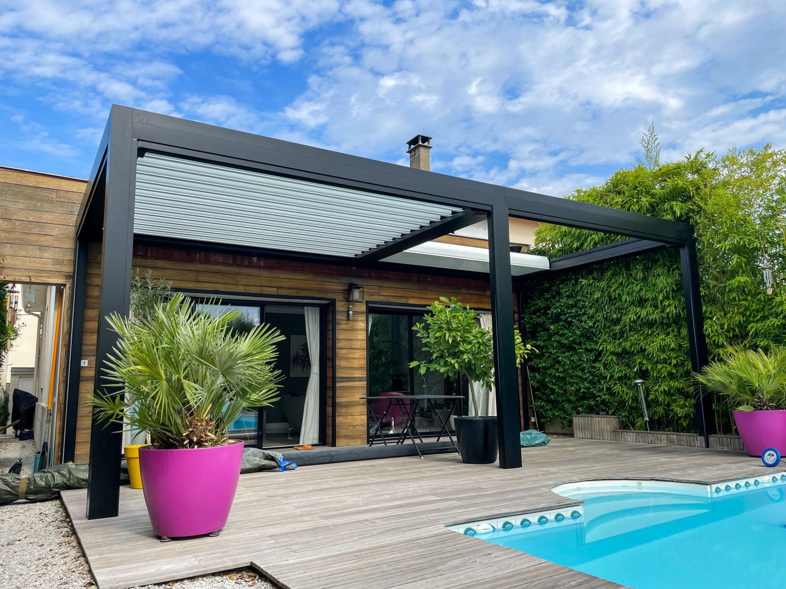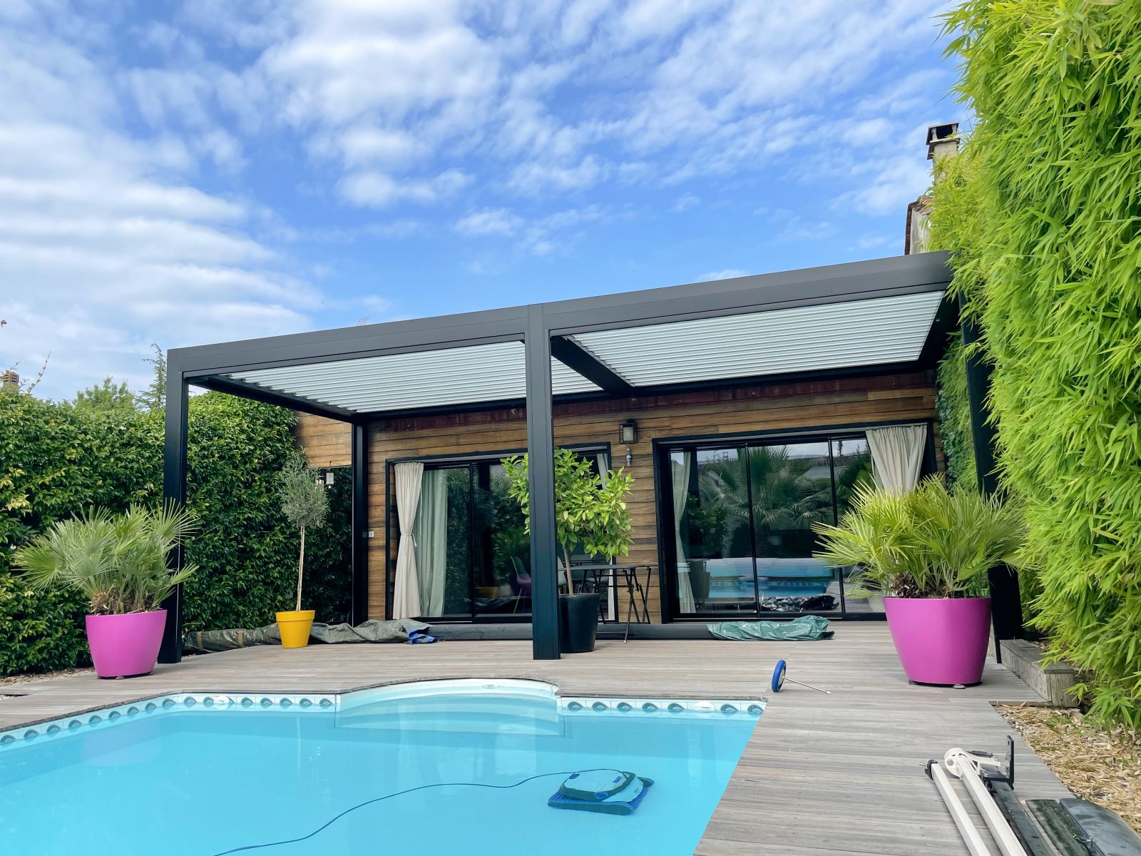 L'Atelier de la création, spécialiste en menuiseries extérieures en Gironde a réalisé la conception et pose d'une double pergola bioclimatique à lames double peau orientables et rétractables, à BORDEAUX (33).