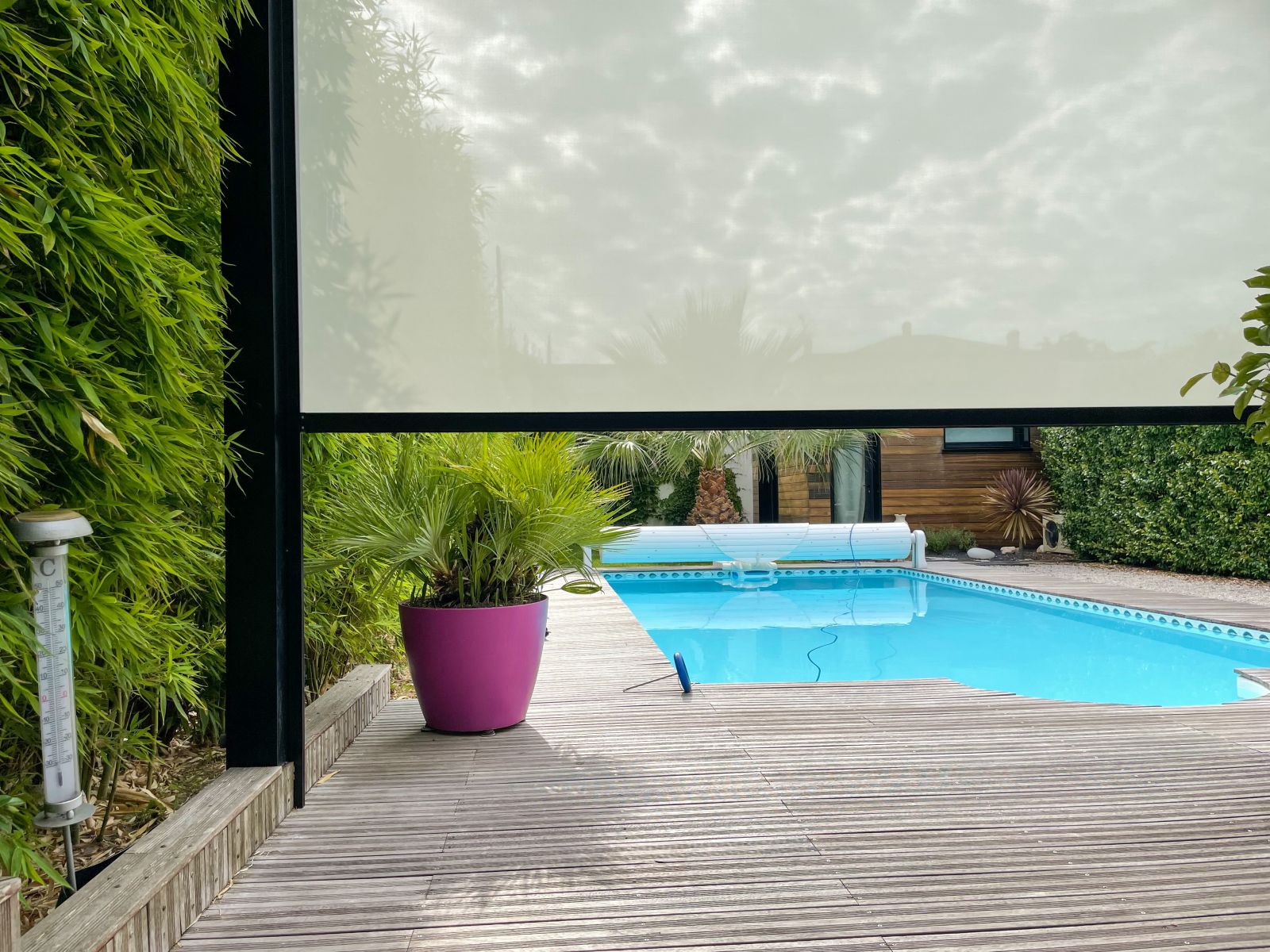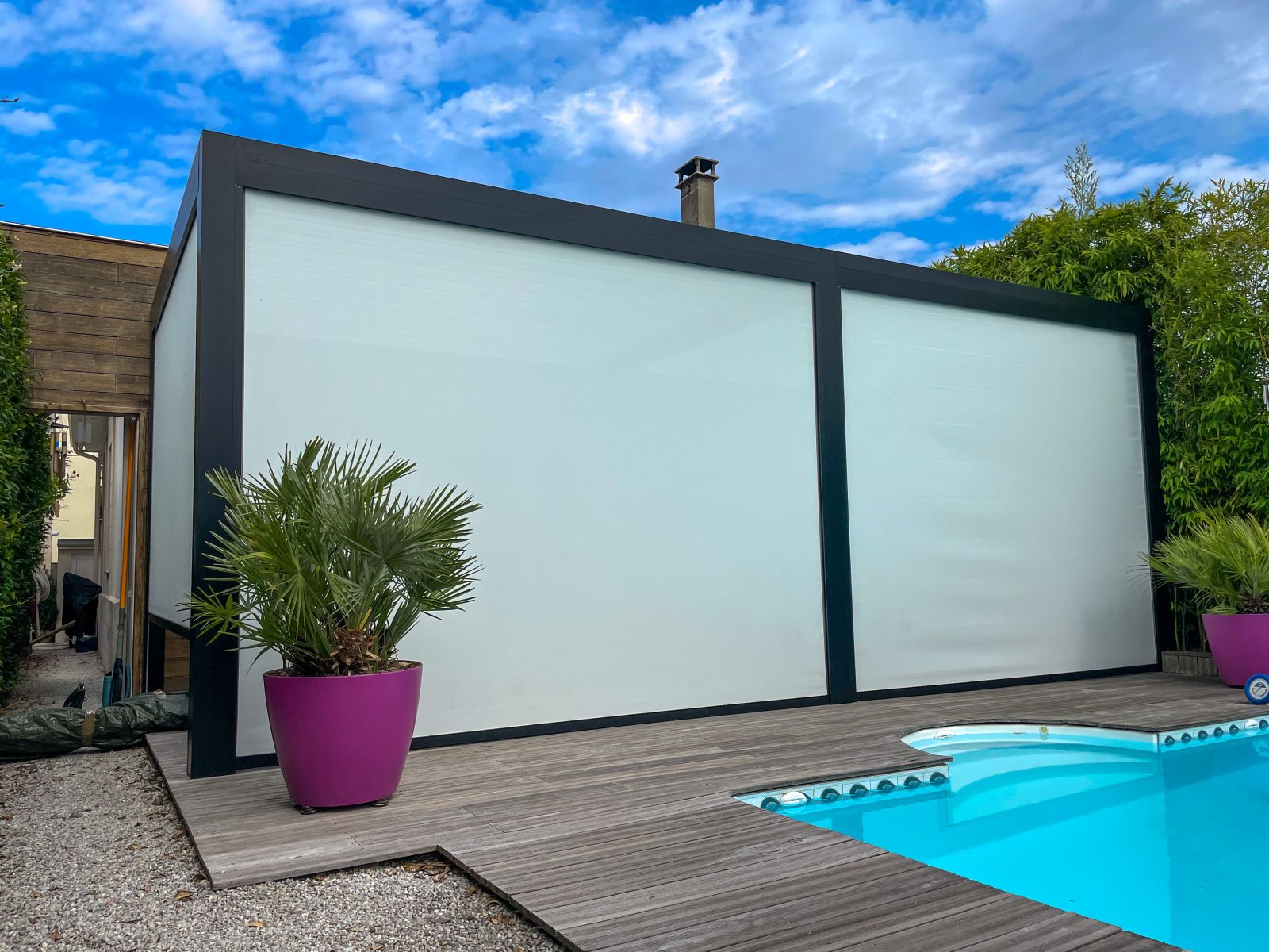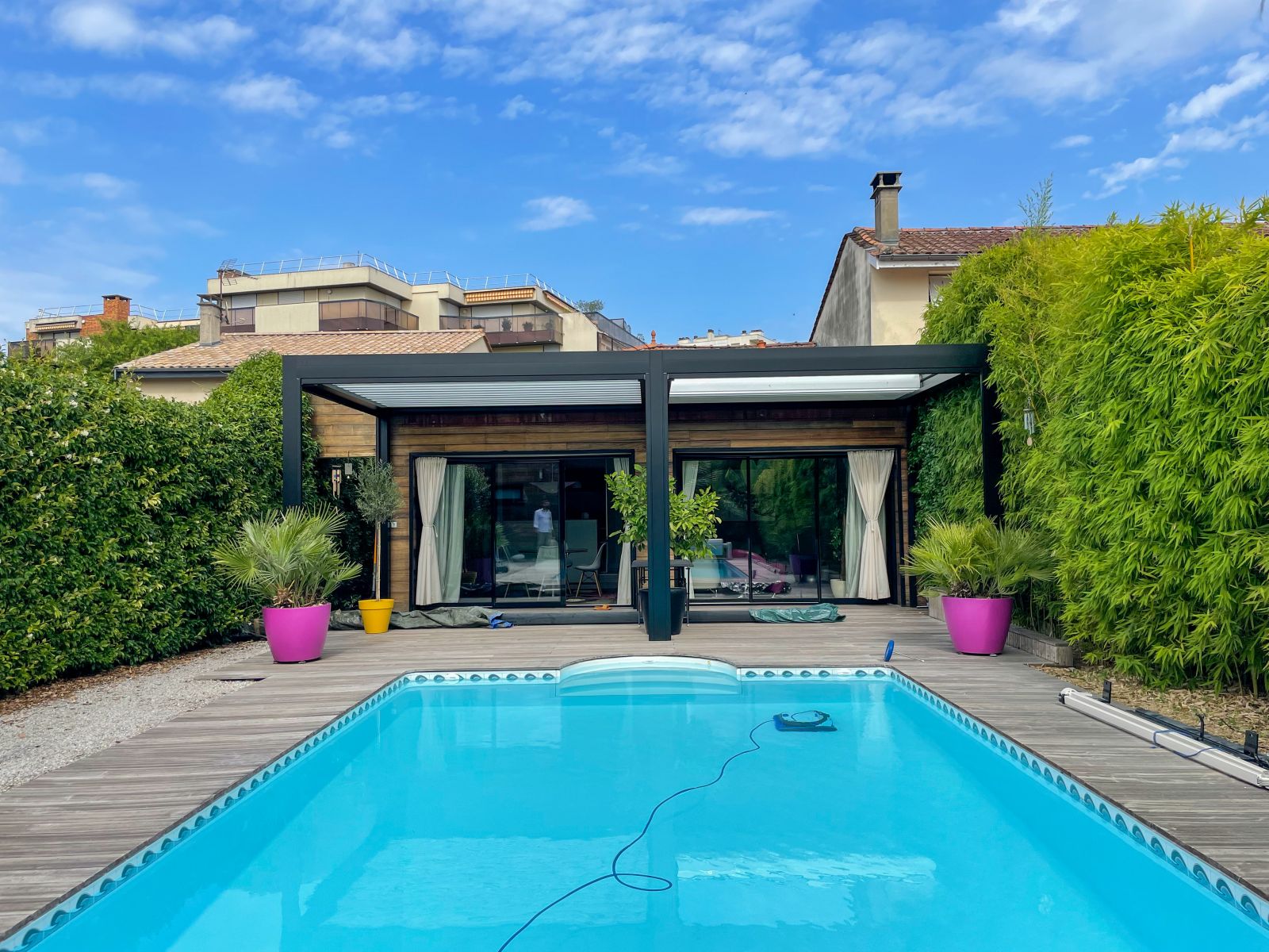 L'Atelier de la création, spécialiste en menuiseries extérieures en Gironde a réalisé la conception et pose d'une double pergola bioclimatique à lames double peau orientables et rétractables, à BORDEAUX (33).