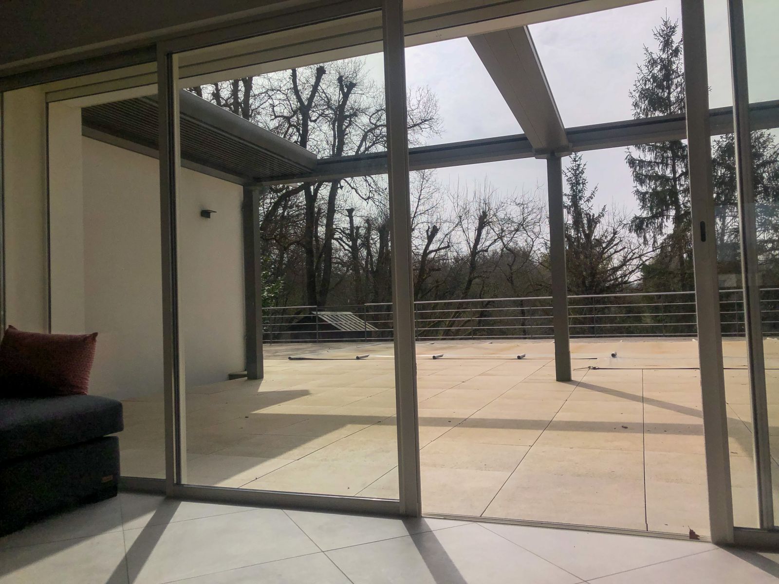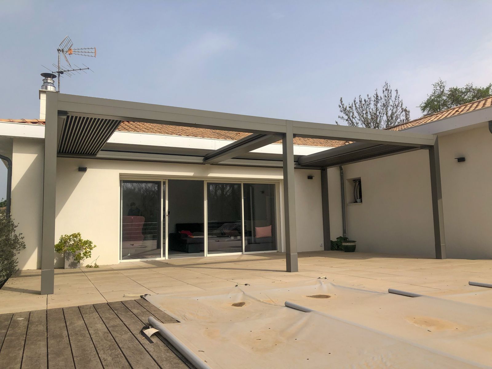 L'Atelier de la création, spécialiste en menuiseries extérieures en Gironde a réalisé la conception et pose d'une double pergola bioclimatique à lames double peau orientables et rétractables, à YVRAC (33).