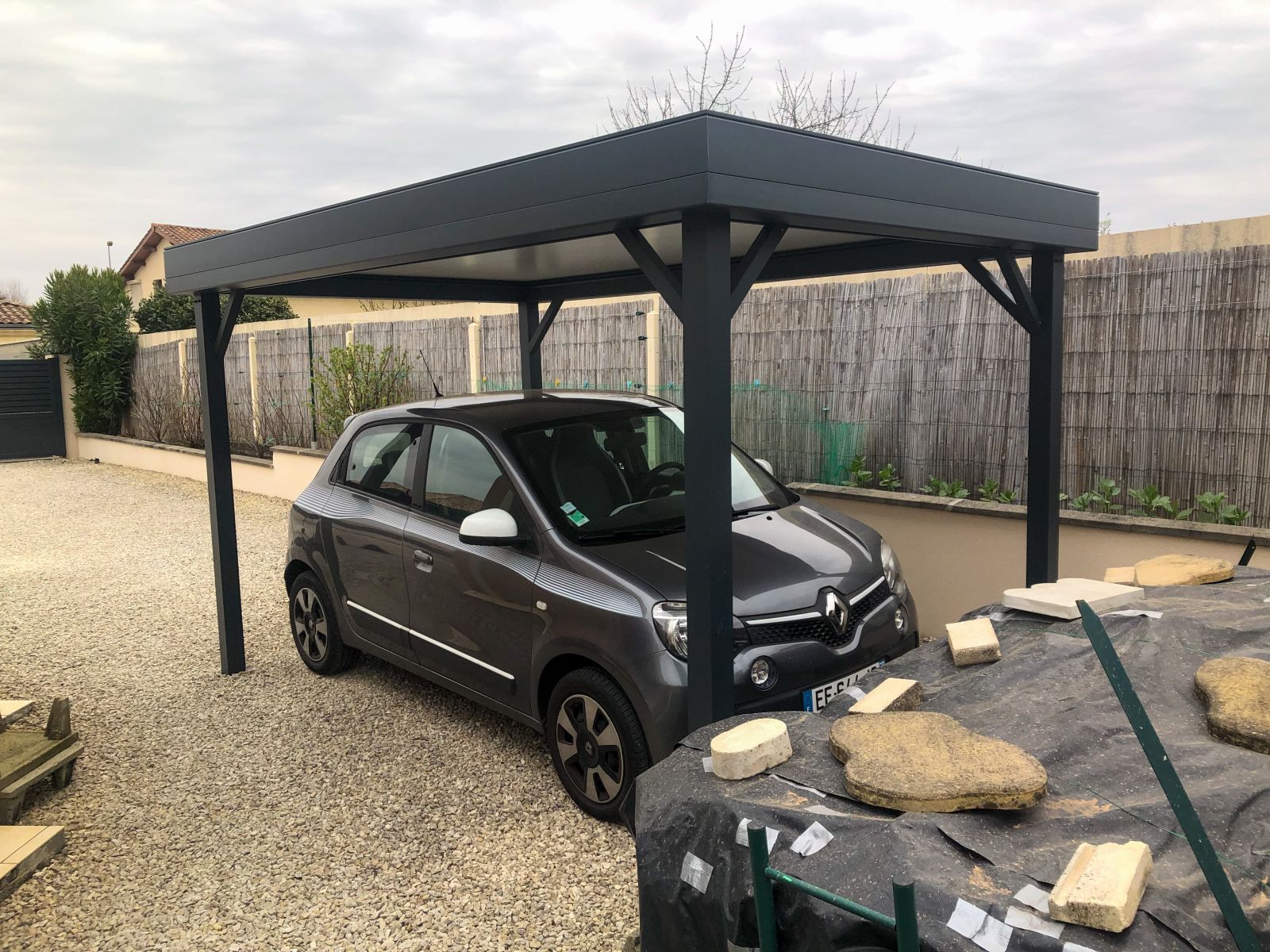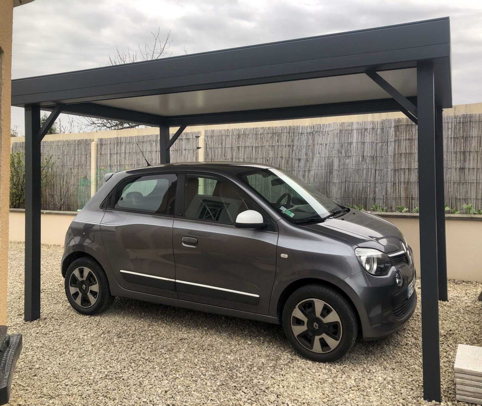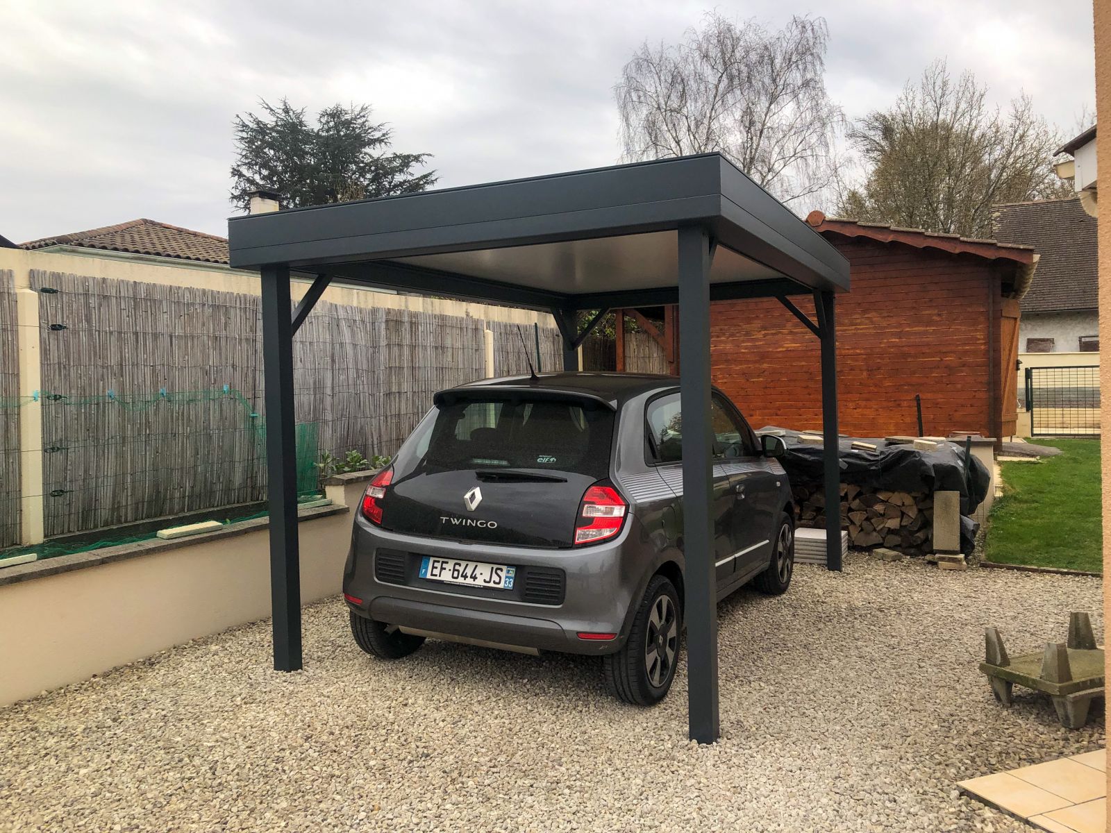 Nous avons posé un carport toit plat de 4m de long en alu RAL 7016 fine structure.