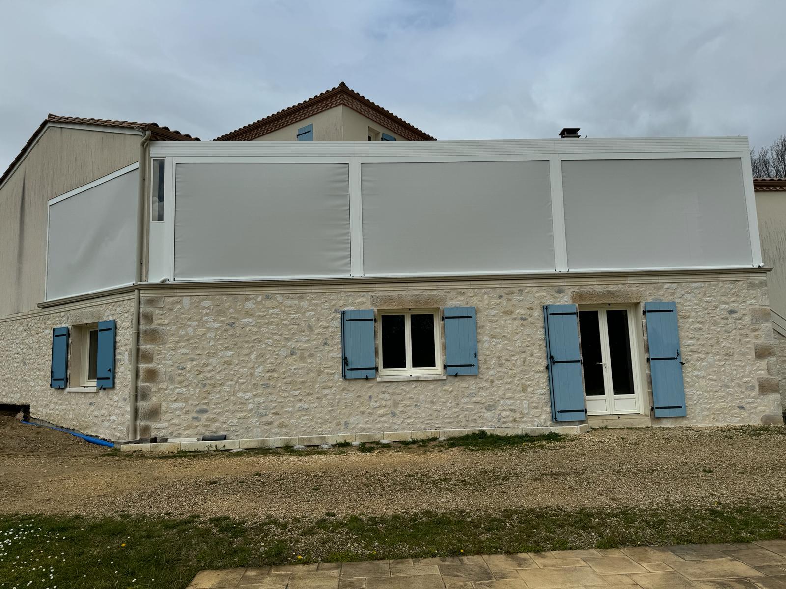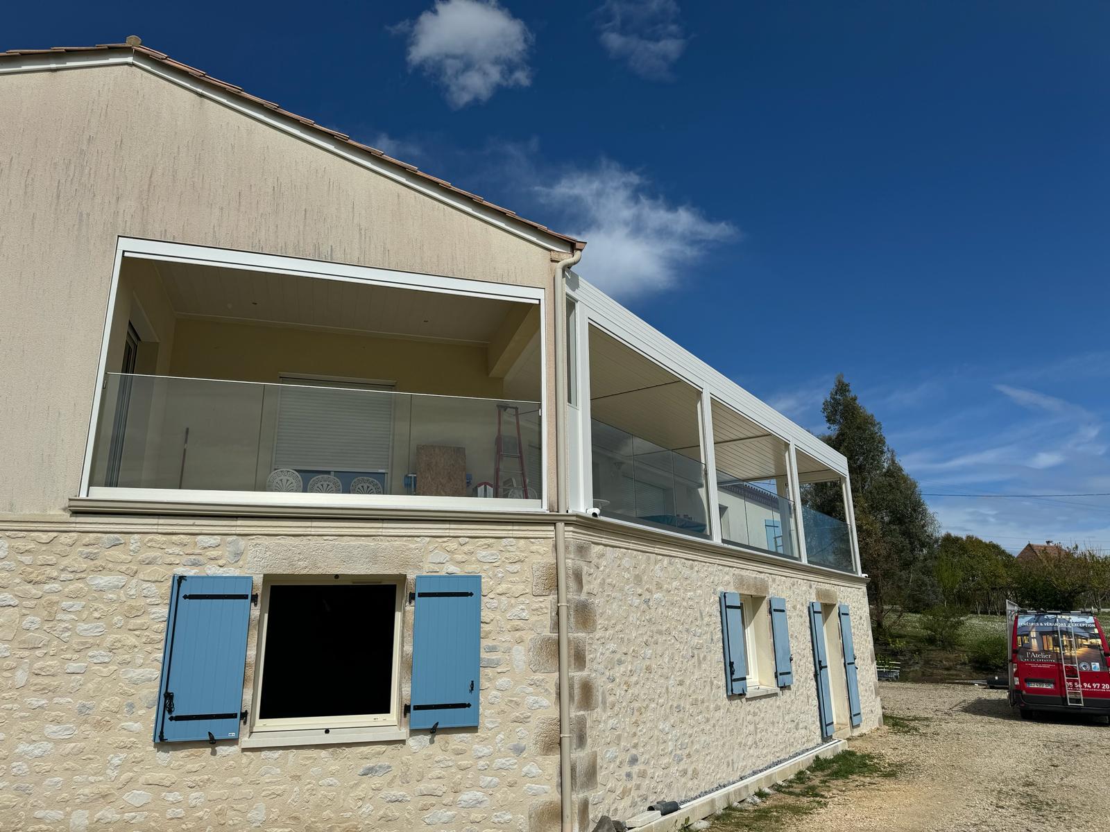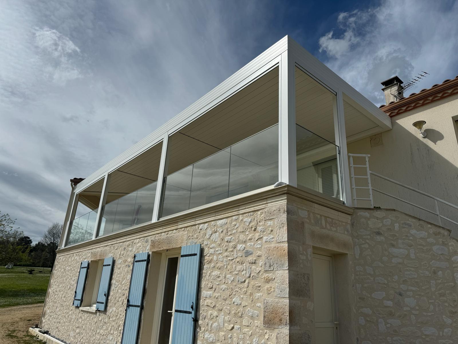 L'Atelier de la création, spécialiste en menuiseries extérieures en Gironde a réalisé la pose d'une pergola bioclimatique et d'un garde corps vitrage à Tresses (33)
