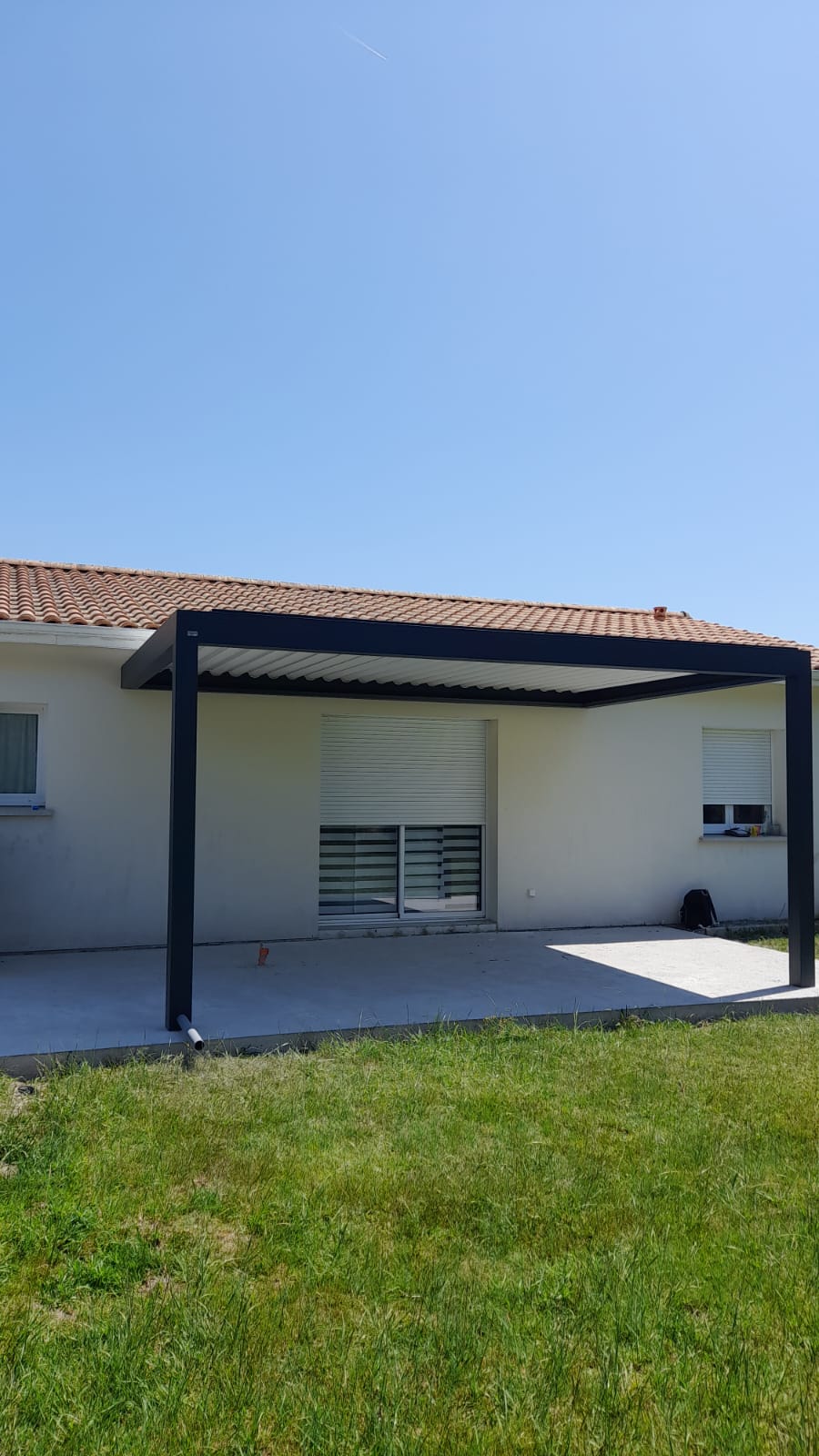 Concernant les spécificités de ce projet : - Pergola bioclimatique adossée teinte gris anthracite avec lames intérieures blanches : un contraste élégant qui s’intègre parfaitement à l’architecture de la maison 🏡