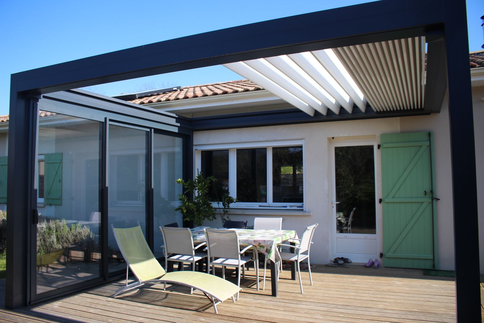 La pergola bioclimatique rétractable vous offre une vision panoramique avec une terrasse à ciel ouvert pour un apport de lumière maximal.